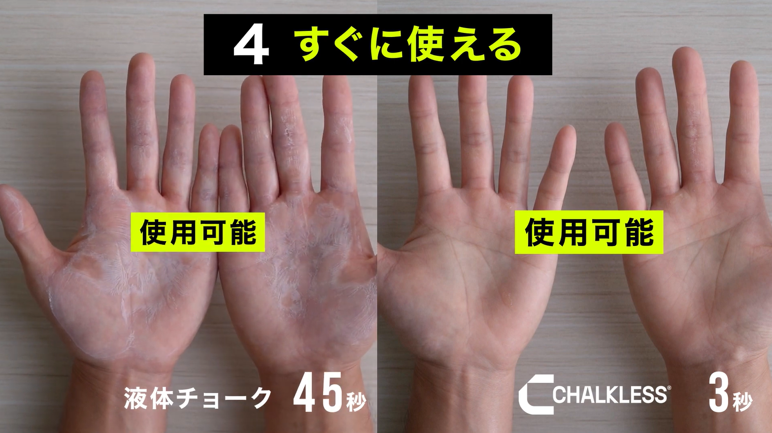 手につけた瞬間から効果を発揮できるのも特徴の1つ。液体チョークのように乾くまで、待つ必要がありません。チョークレスは手につけた瞬間から効果を最大限発揮します。