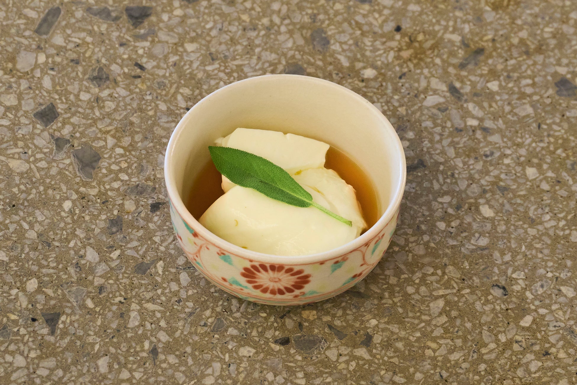 ハーブを使ったミルクプリンに烏龍茶の自家製シロップ