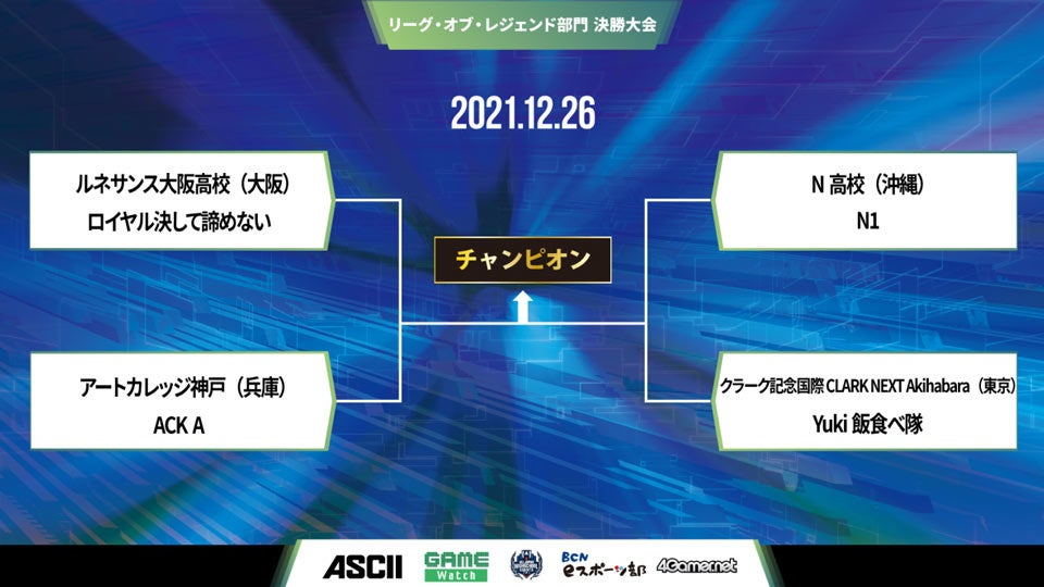 2021年12月26日(日)、予選ブロックから勝ち上がった4チームによる「League of Legends(リーグオブレジェンド)部門」決勝大会が行われた。
