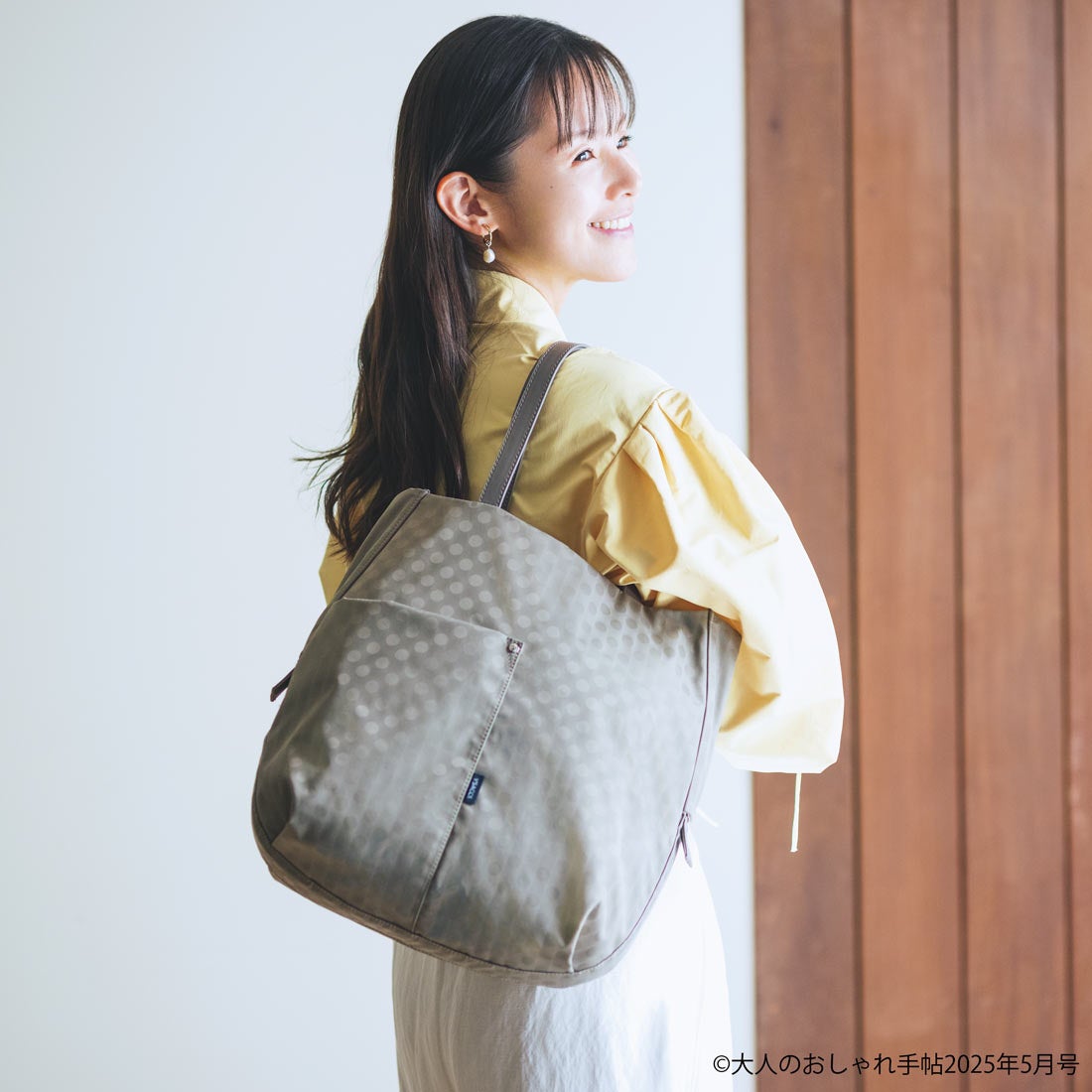 「シンプルなトートだから、ドット柄の生地で遊び心をプラスしました。 昼間はアウターを脱いでバッグにしまいたい……なんてときにも便利な大容量です」