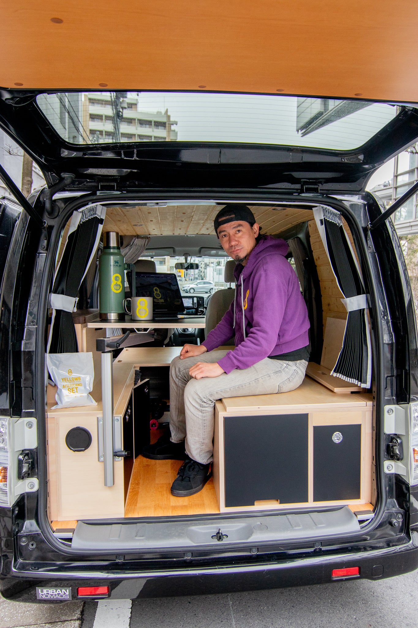 車内には多く天然木を使い、木の香りが残る心地よい空間。ベッドの上で座っても頭が天井に当たることなく、快適に過ごせる仕様になっています。また、今回協業の「YELLOW8株式会社」は八丈島でカフェを運営しており、環境に配慮したレンタカーと自社運営カフェと連携したロードトリップを体感頂けます。