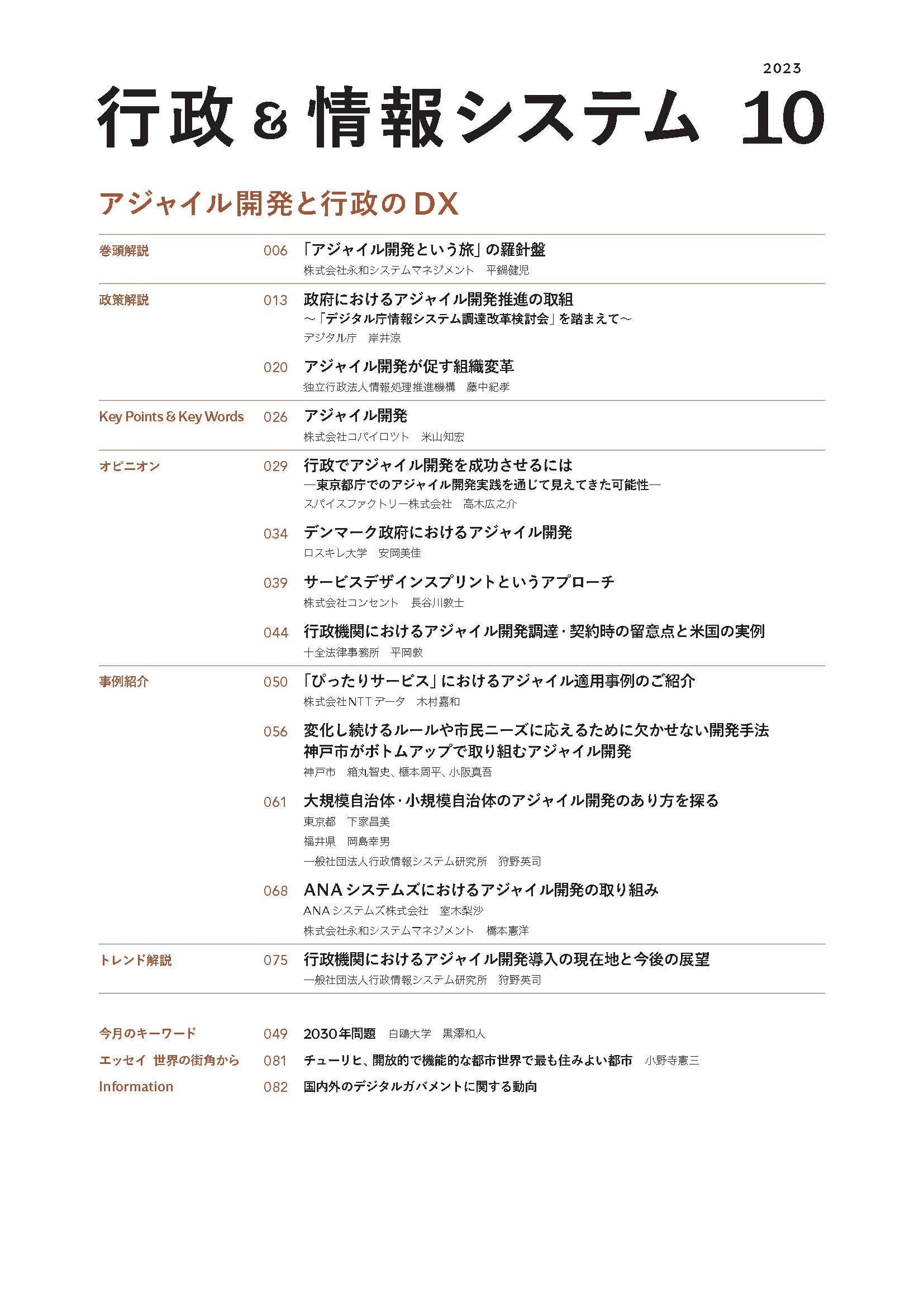 そこで今号では、「アジャイル開発」について特集し、行政にとってのアジャイル開発の意義や実践にあたっての課題、解決の方向性など、アジャイル開発の導入を考える上で求められる知見を、有識者による解説、基礎知識の整理、政策動向の解説、行政機関や民間企業での事例の紹介、最近の調査研究の成果の解説などを通じて、多角的に明らかにしていきます。これにより、読者が今後の行政におけるアジャイル開発の可能性や課題を俯瞰的・体系的に理解し、現場での実践に繋げられるようにすることを目指します。