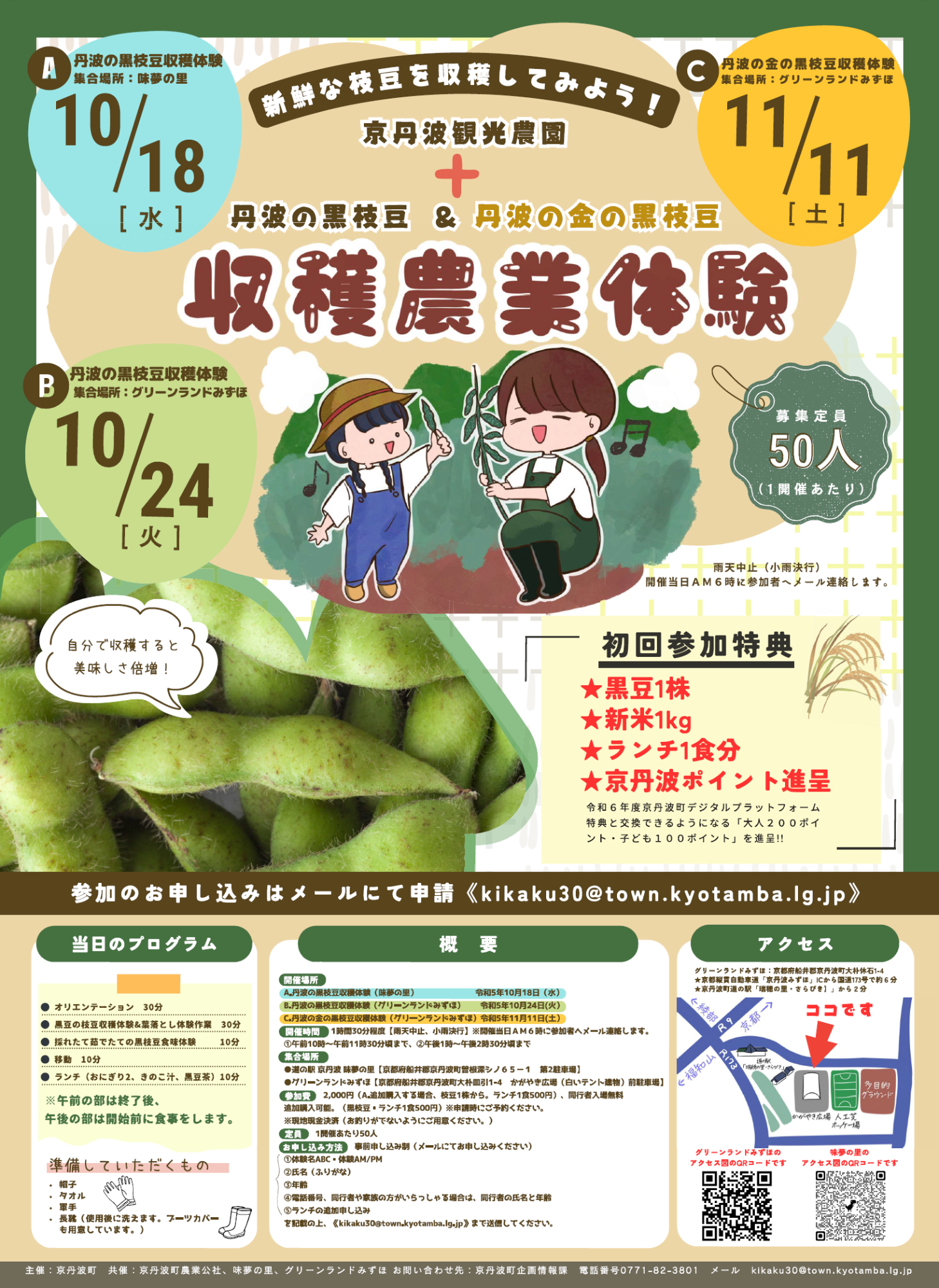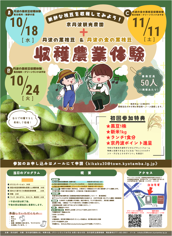 ・内容:町長、共催者等が黒枝豆の収穫体験の指導者として体験の付加価値を向上させます。