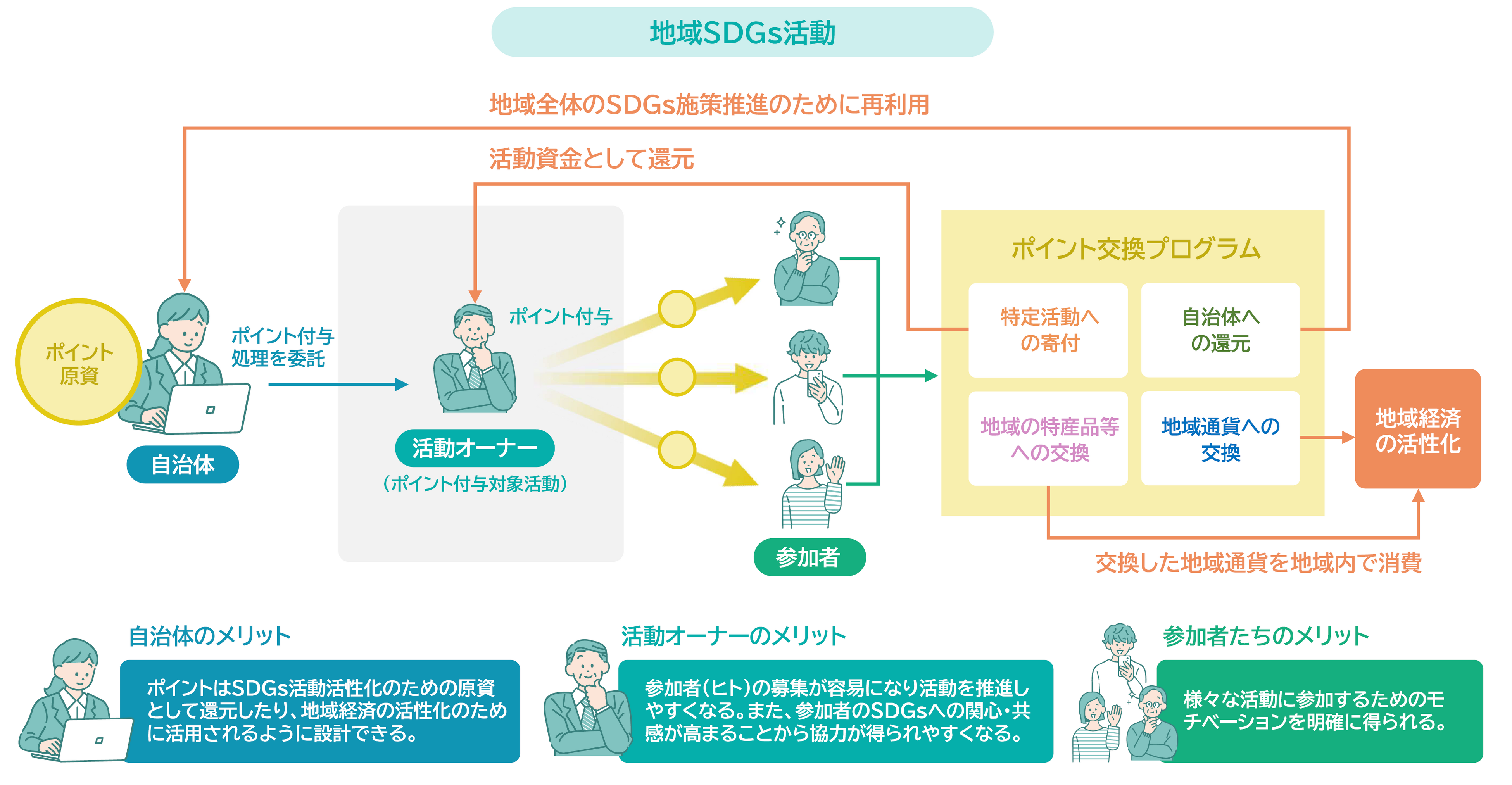 プラットフォームの参加者は、町内の色々な人たちや場所へ赴き、地域活動に参加しながら、町民同士の助け合い、ボランティア活動で活躍し、誰ひとり取り残されない環境づくりの一助となります。