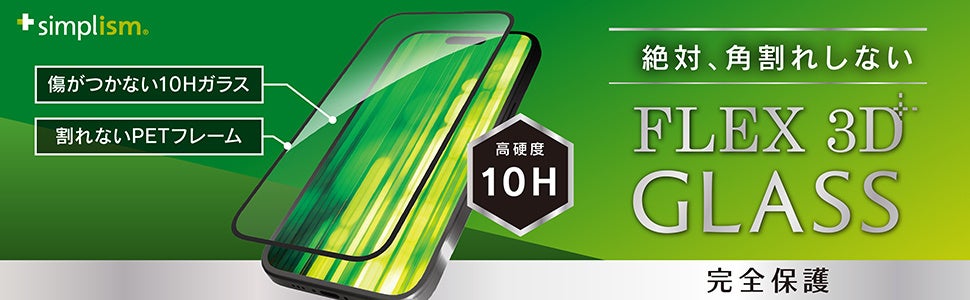 当社の画面保護ガラスの中で1番売れているのが[FLEX 3D]シリーズ。絶対角割れしない、強化ガラスとPETフレームの複合構造のガラスプロテクターです。強化ガラスで画面を保護し、端末形状に沿った立体成型のPETフレームが周りを覆うことで、角からの落下や衝撃で起こる角割れを防ぎます。
