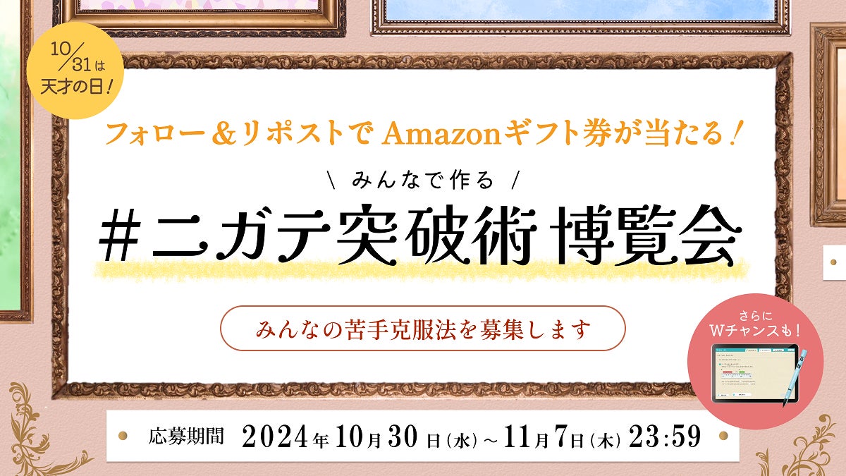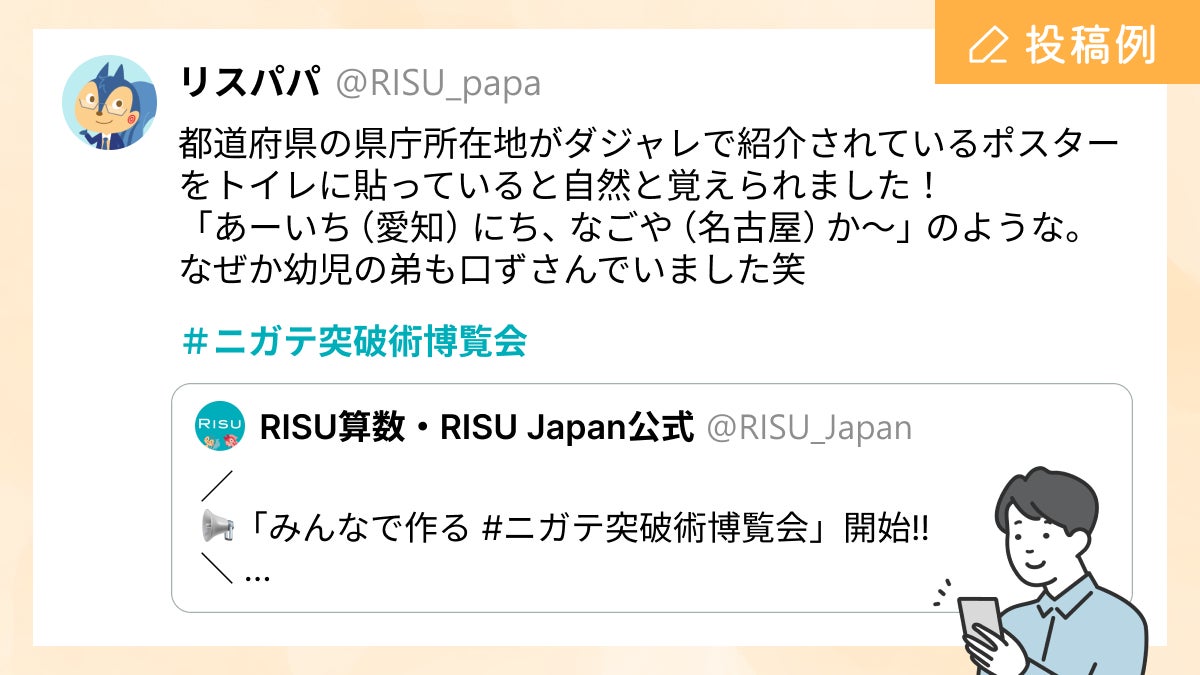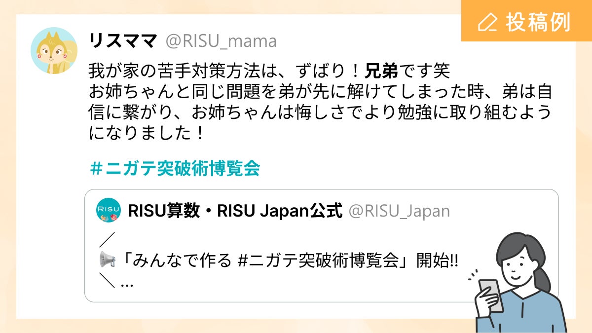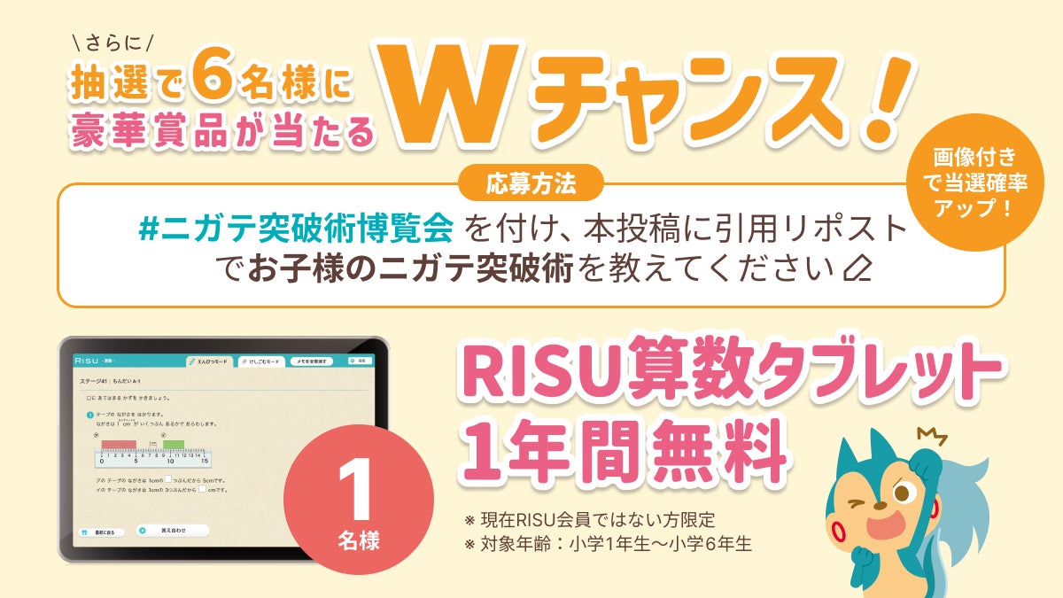 タブレット教材「RISU 算数」を提供するRISU Japan株式会社(本社:東京都文京区、代表取締役:今木智隆)は、10月30日(水)から1週間、X(旧:Twitter)にて、みんなの苦手克服法を募集し、「みんなで作る#ニガテ突破術博覧会」を開催いたします。