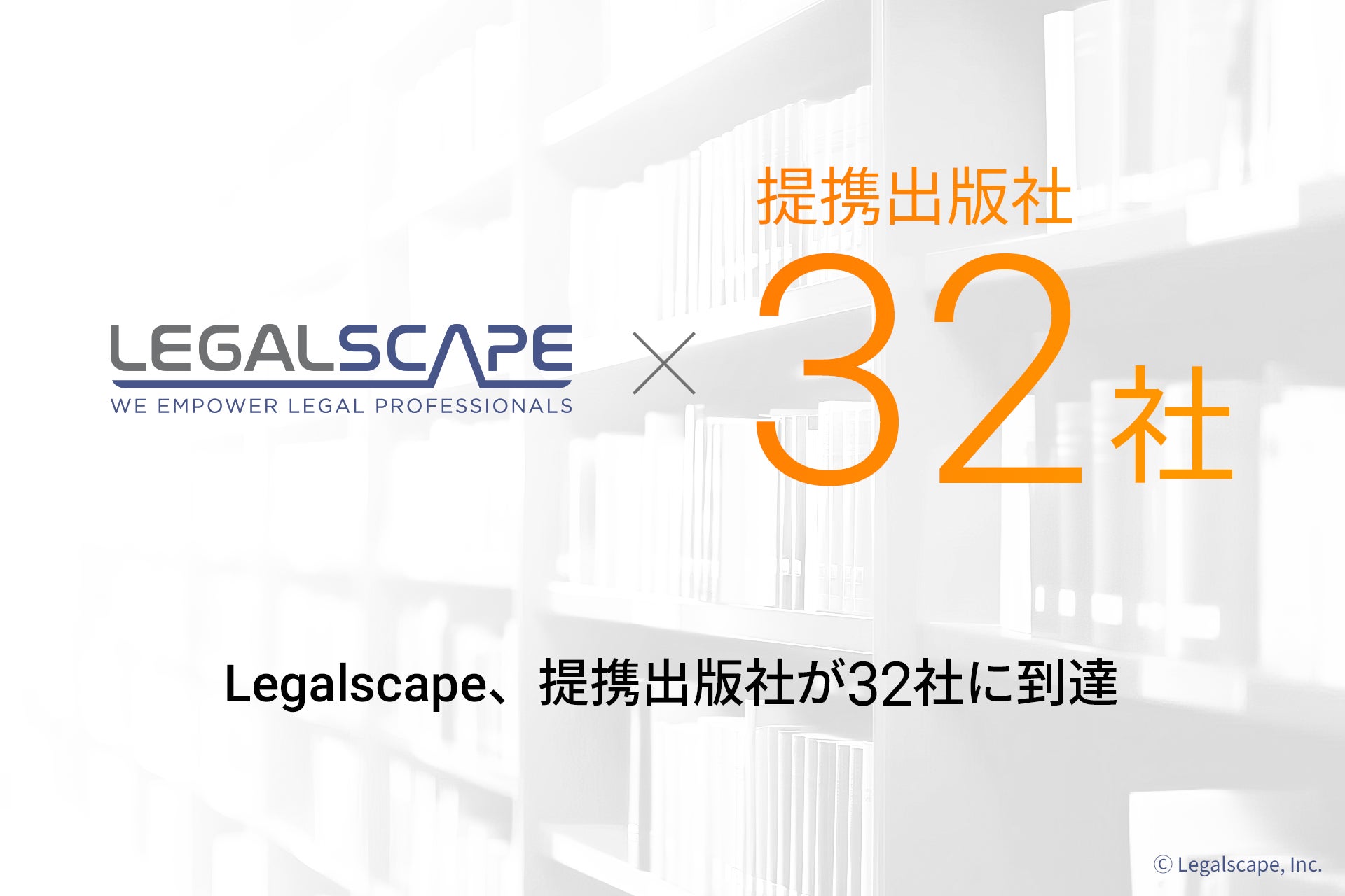 株式会社Legalscape(本社:東京都文京区 代表取締役社長・最高経営責任者 八木田 樹、以下Legalscape)は、提携出版社が32社に到達したことをお知らせします。また、リーガルリサーチプラットフォーム「Legalscape」の収録書籍数は2,800冊を超えるとともに、法律分野を中心としたデジタル版書籍のECサイト「Legalscape Store」での取り扱い書籍数も順調に増加しております。