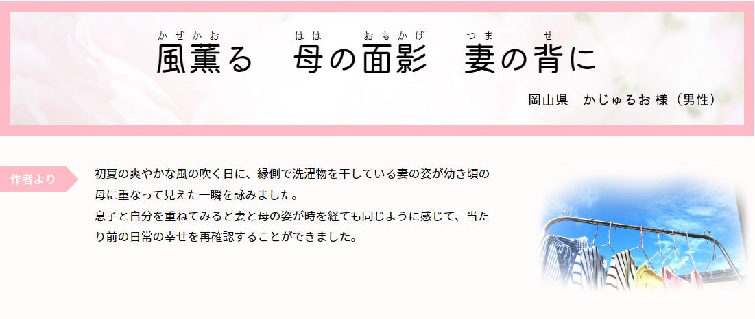 [作者より] 初夏の爽やかな風の吹く日に、縁側で洗濯物を干している妻の姿が幼き頃の母に重なって見えた一瞬を詠みました。息子と自分を重ねてみると妻と母の姿が時を経ても同じように感じて、当たり前の日常の幸せを再確認することができました。