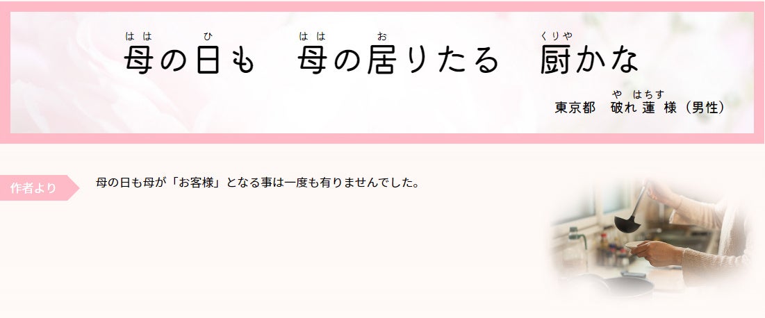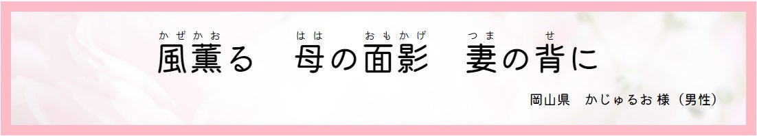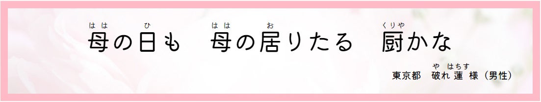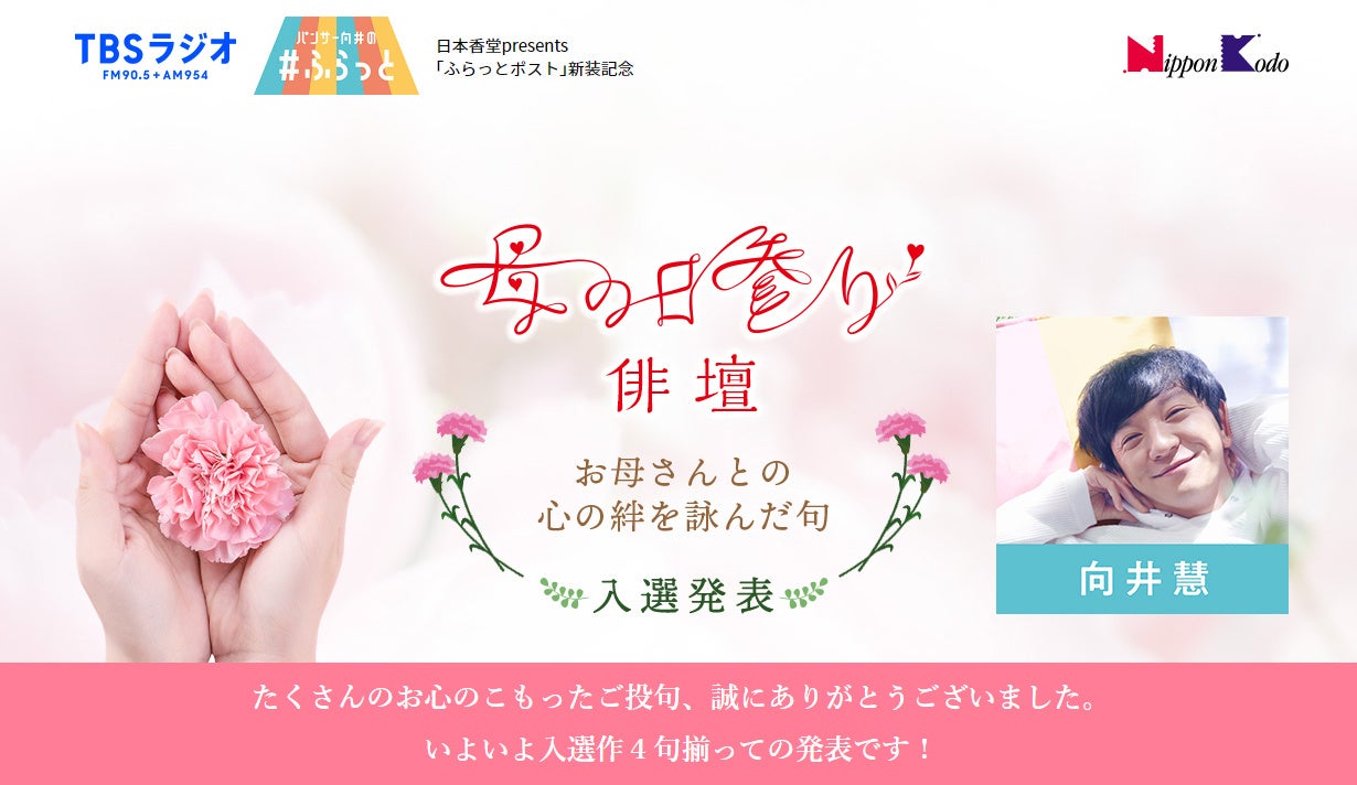 株式会社日本香堂(代表取締役社長 土屋 義幸)では、今年の「母の日」(5月8日)に向けて“母との心の絆”を詠んだ俳句作品を公募した 『母の日参り 俳壇』の入選作4句を、このたび同社提供のTBSラジオ朝のワイド番組「パンサー向井の#ふらっと」(月~木 8:30~11:00)内「ふらっとポスト」コーナー(8:41頃)の5月2日・3日放送回にて発表。併せて、同社サイト内特設ページにおいても入選作の掲載を開始いたしました。