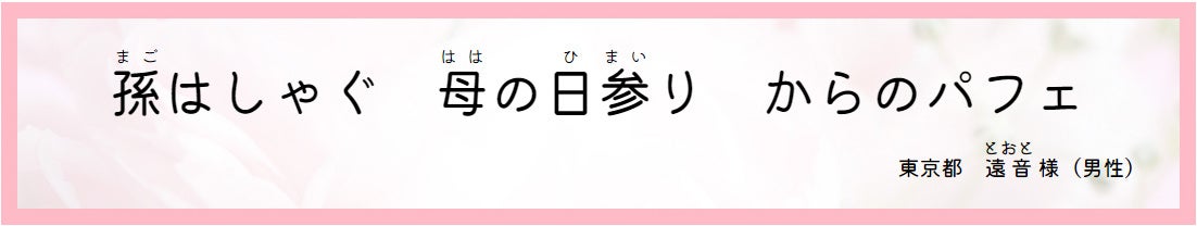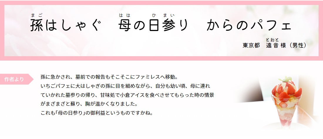 [作者より] 孫に急かされ、墓前での報告もそこそこにファミレスへ移動。いちごパフェに大はしゃぎの孫に目を細めながら、自分も幼い頃、母に連れていかれた墓参りの帰り、甘味処で小倉アイスを食べさせてもらった時の情景がまざまざと蘇り、胸が温かくなりました。これも「母の日参り」の御利益というものですかね。