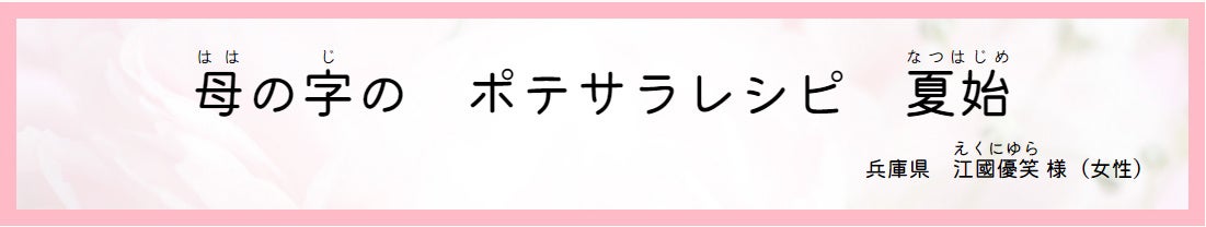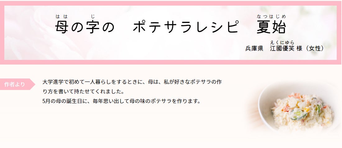 [作者より] 大学進学で初めて一人暮らしをするときに、母は、私が好きなポテサラの作り方を書いて持たせてくれました。5月の母の誕生日に、毎年思い出して母の味のポテサラを作ります。