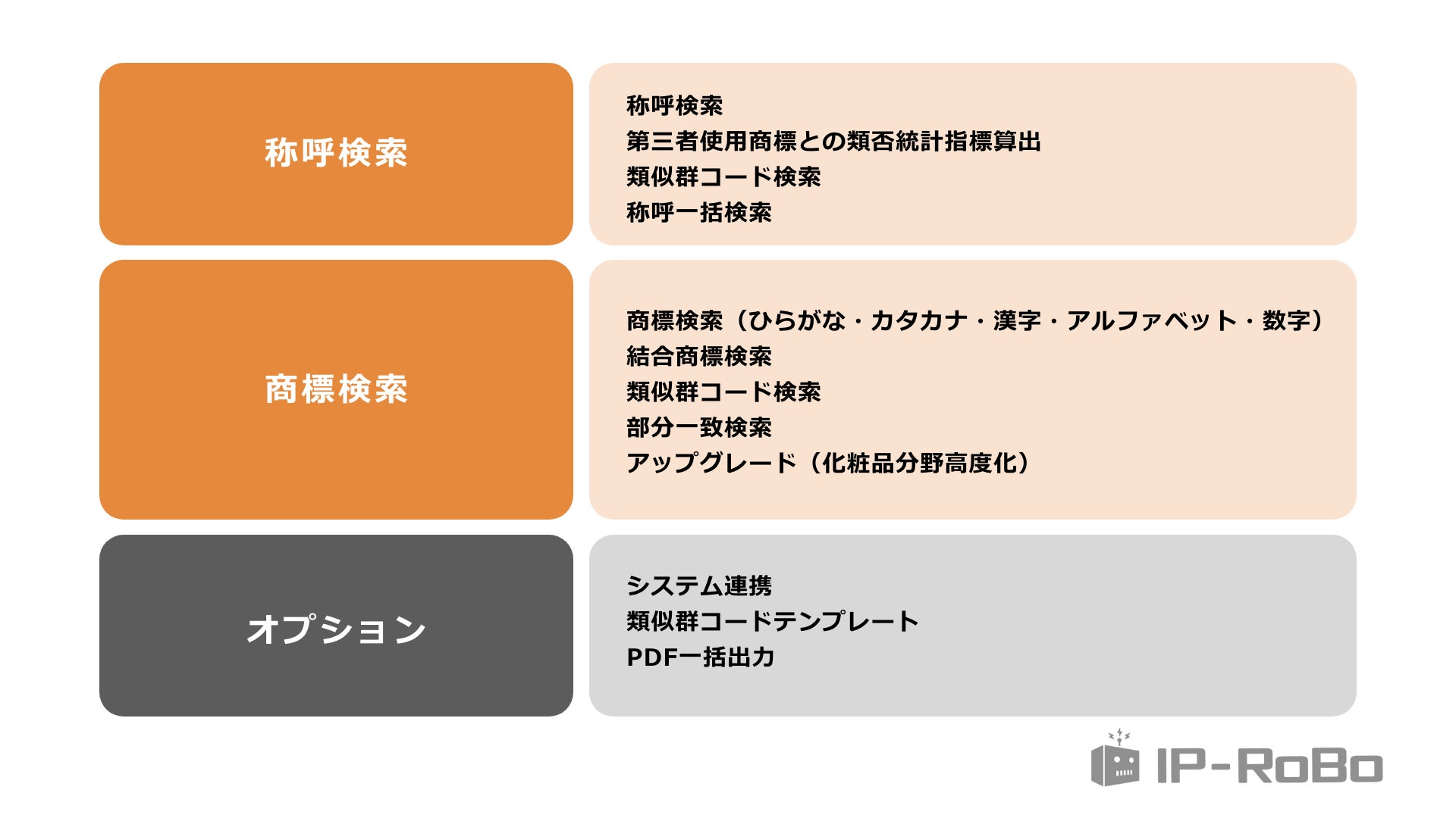 今回新たにリリースした商標生成機能のほかに、下記機能をラインナップしております(一部有料オプション)。