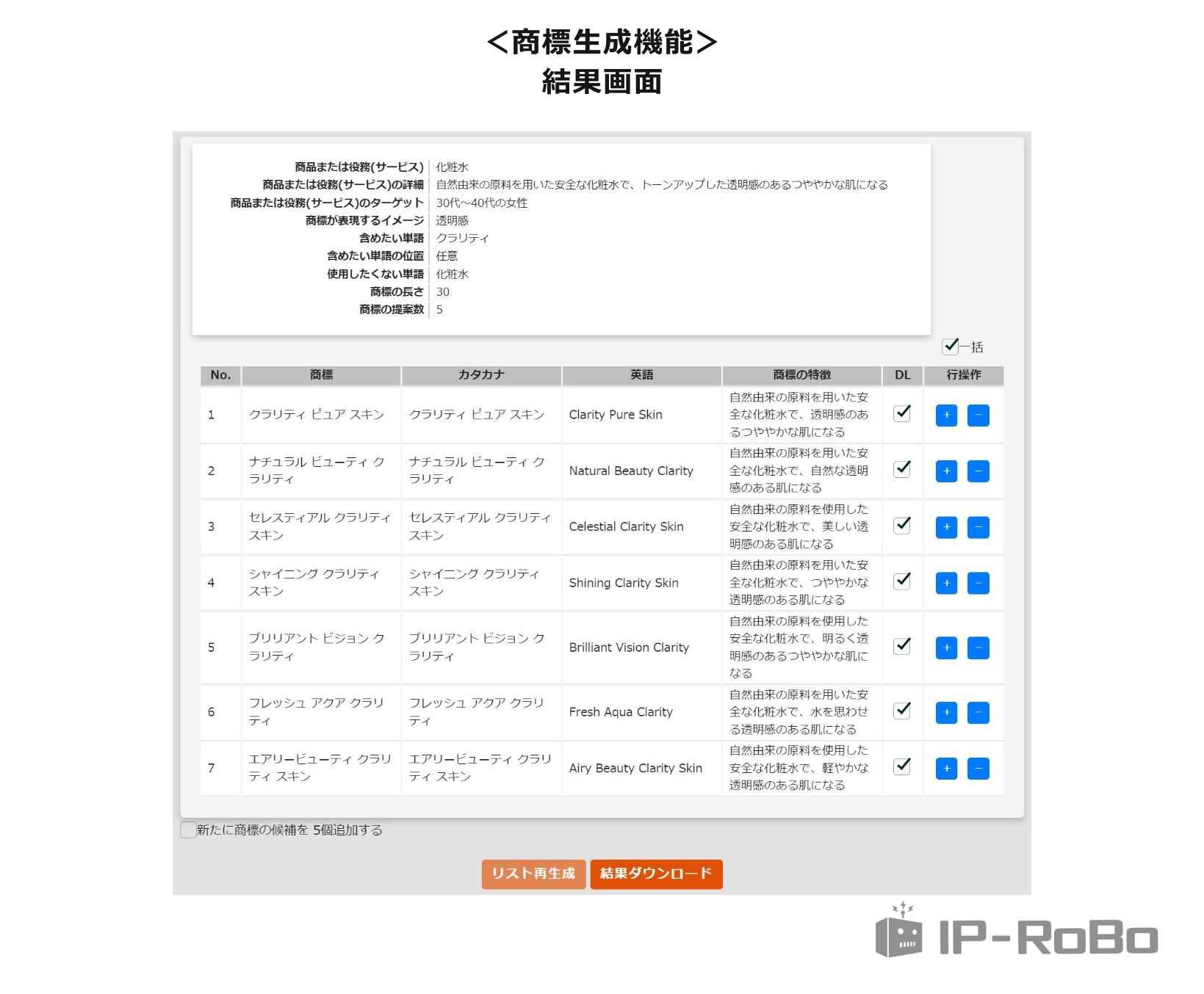 AIが、1で指定された条件にマッチする複数の商標案を生成します。単に商標を生成するだけでなく、読み方、英文表現、生成された商標の特徴等も併せて出力します。