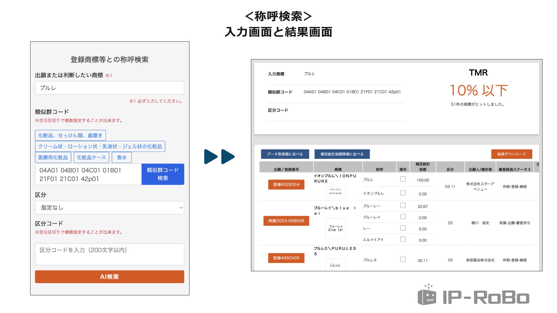 更に、生成された商標案については、TM-RoBoの既存機能である<商標検索機能>等で、商標調査についても同時に行うことができます。
