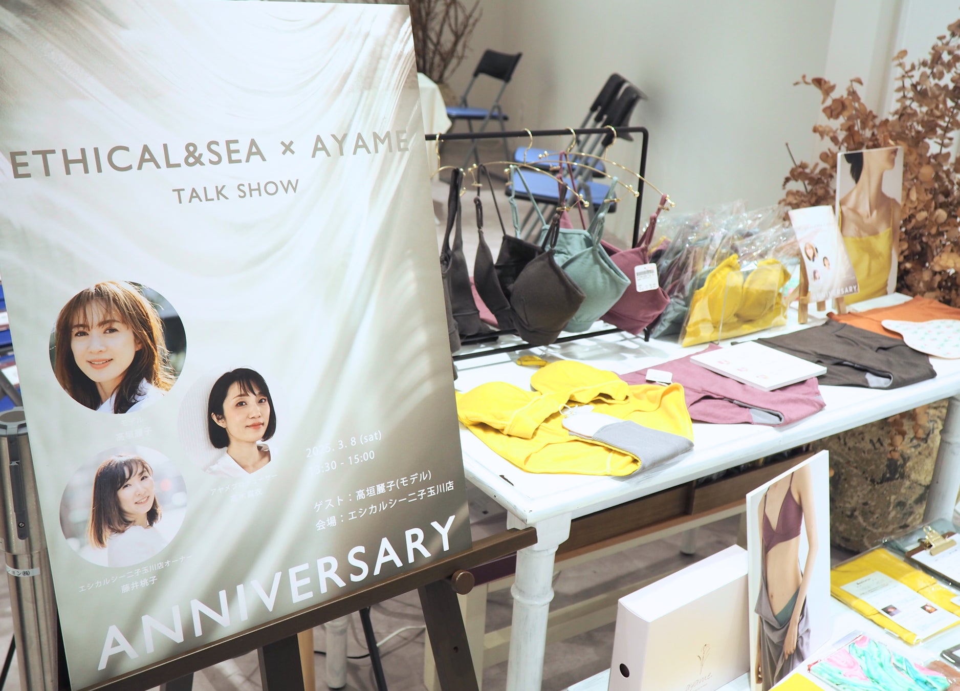 株式会社フラッグ(東京都港区 代表取締役:吹上直子)が展開するセレクトショップブランド「Ethical&SEA(エシカルシー)」の「Ethical&SEA(エシカルシー) 二子玉川ライズ・ドッグウッドプラザ店」(運営:株式会社sign(東京都品川区、代表取締役社長:藤井桃子))にて、モデルの高垣麗子さんをゲストにお迎えし、インナーウェアブランド「ayame(アヤメ)」の4周年、エシカルなライフスタイルを提案する「Ethical&SEA 二子玉川ライズ・ドッグウッドプラザ店 」の2周年を記念した国際女性デー特別トークイベントを開催いたしました。