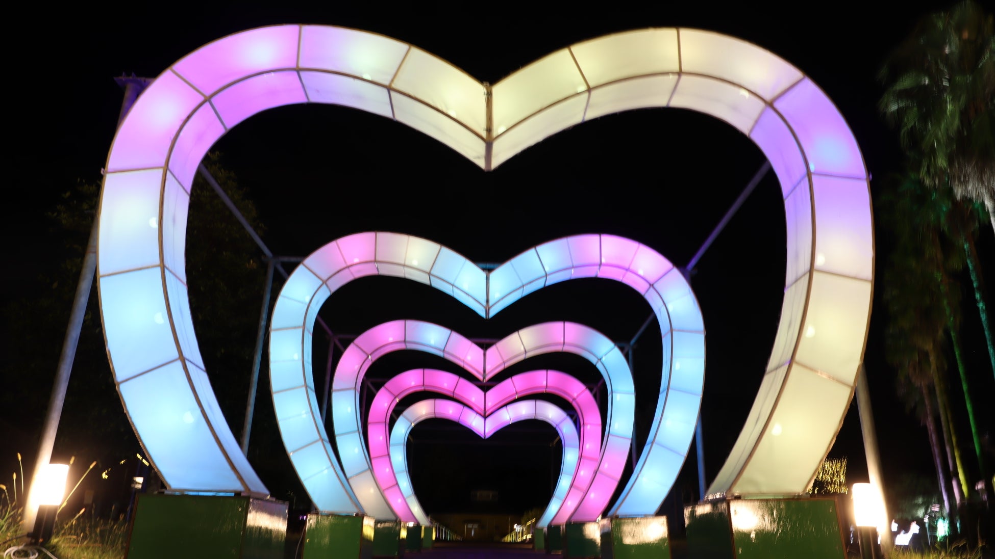 大きなハート型のオブジェがカラフルな色に変化するPOPな雰囲気のトンネル。