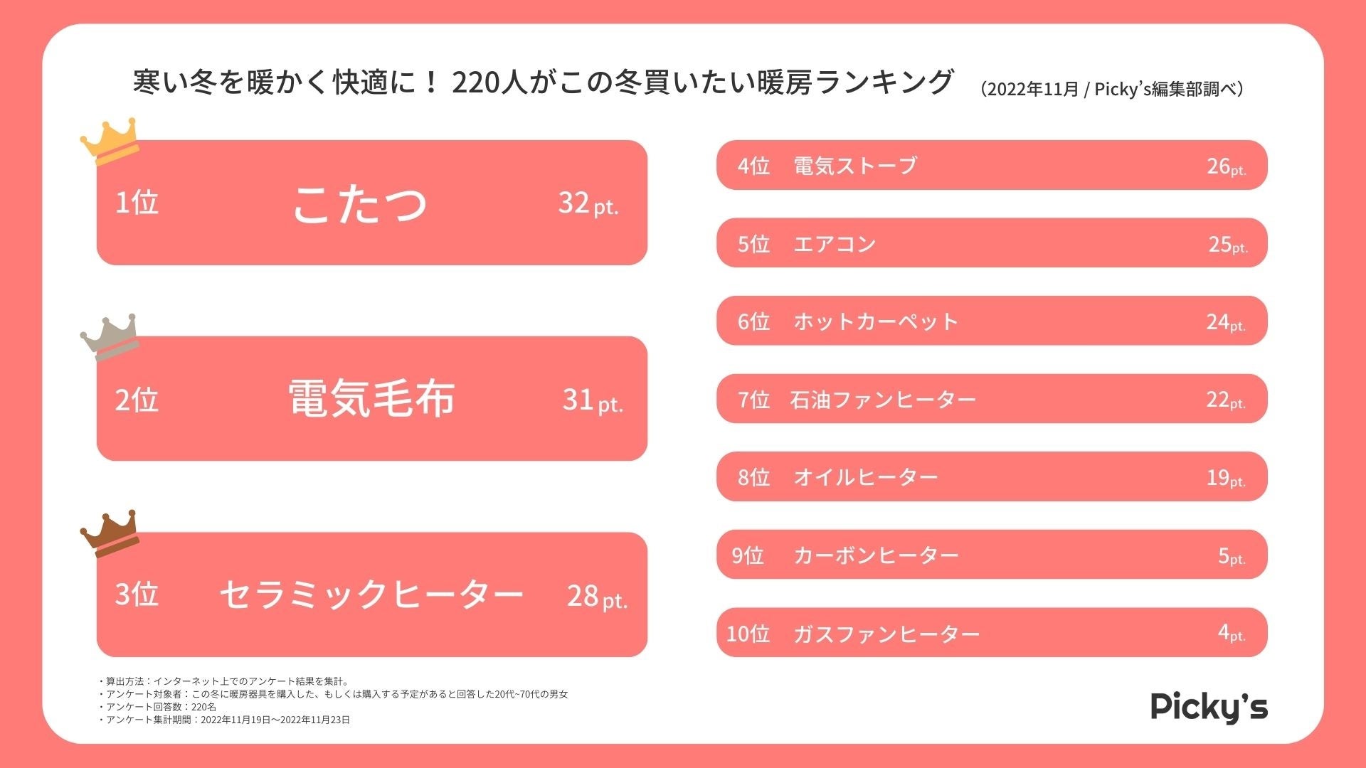 このたびPicky’s(https://rentry.jp/note/)では、寒い時期に向けてこの冬に買いたい暖房器具についてインターネット上でアンケート調査を行い、ランキングを作成いたしましたので発表いたします。