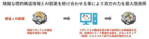 従来手法においては、標的タンパクに対して膨大な量の活性化合物との組み合わせを試す作業が必要で、これにより多大なコストと時間が必要となっている事が課題とされています。今回の戦略的業務提携からくる技術プラットフォーム(構造解析xAI創薬)により、我々は創薬ターゲットと活性化合物の繋がりを可視化する事ができます。これによって、より効率的・効果的に活性化合物の探索、評価を進めて行く事が可能となり、迅速な化合物の設計および最適化を行ってまいります。