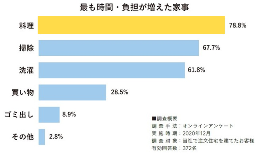 コロナ禍での内食ニーズの高まりを受け、おうちご飯を楽しみたいけれど、家事の負担増に悩んでいるお客様も多くいらっしゃいます。実際に、オープンハウス・アーキテクトで建築されたオーナー様向けアンケートでは、コロナ禍で最も負担が増えた家事として「料理」が挙げられました。