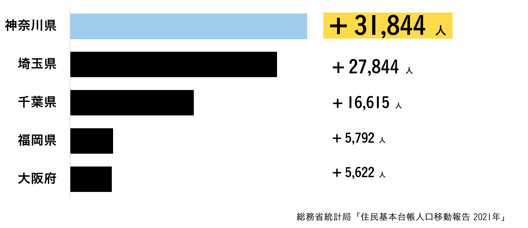 コロナ特需以前から、神奈川エリアの仲介物件数は急拡大しています。2022年1月に総務省から公表された人口移動調査でも、神奈川県は転入者数から転出者数を引いた転入超過数がプラス3万1844人 (前年比2,270人増) と、全国で1番人口が流入していることがわかります。
