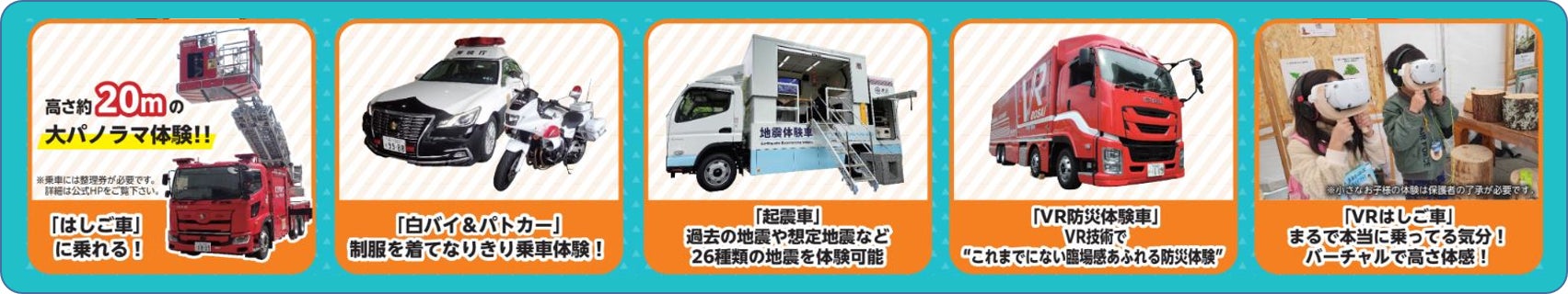 会場内では前回も登場し大人気だった「はしご車」や様々な地震を体験することが可能な「起震車」、「VR防災体験車」はもちろん、今回は白バイやパトカーの乗車体験も! 「はしご車」体験では、TBS放送センターの目の前で高さ約20mの大パノラマを体験することができます!