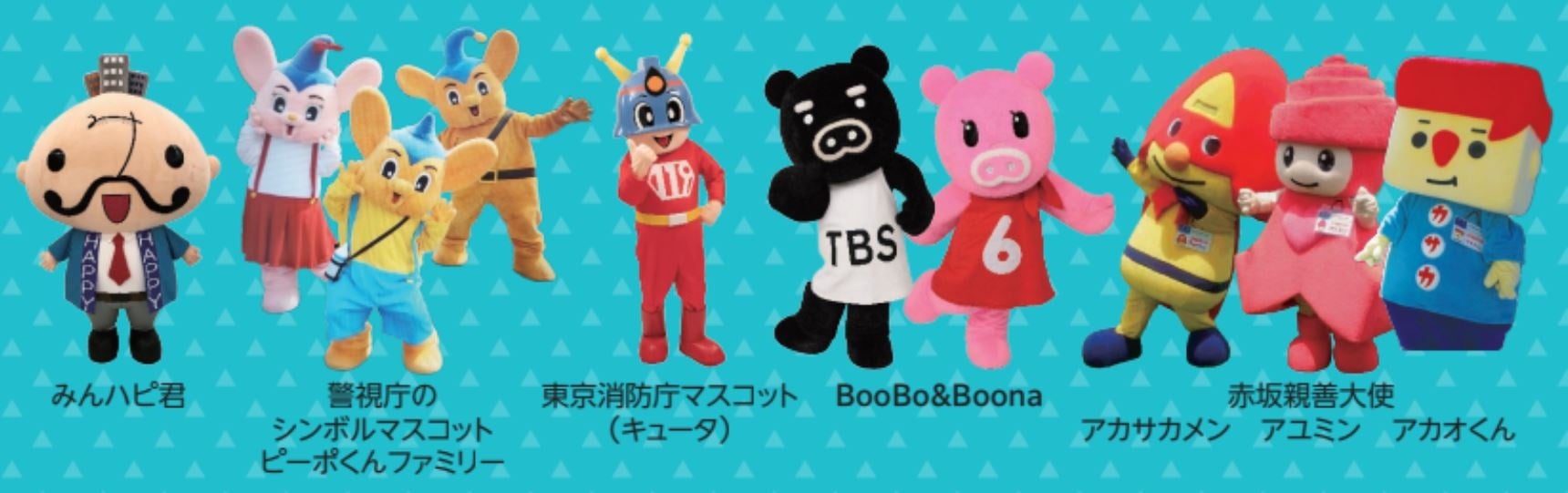 さらにTBS番組応援キャラクター「BooBo&Boona」をはじめ、東京消防庁マスコット「キュータ」、警視庁のシンボルマスコット「ピーポくんファミリー」、赤坂親善大使「アカサカメン」「アユミン」「アカオくん」、三井不動産ビルマネジメントのマスコットキャラクター「みんハピ君」など人気キャラクターたちも集結! 記念撮影も可能です。