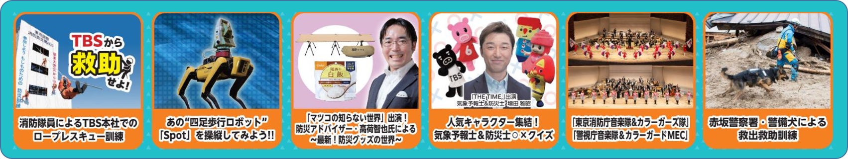 “元自衛官芸人”やす子が登場するほか、『マツコの知らない世界』にも出演した“備え・防災アドバイザー”高荷智也氏が最新防災グッズを紹介します。また、TBS放送センターを使用した消防隊員によるロープレスキュー訓練、赤坂警察署・警備犬による救出救助訓練なども行われます。