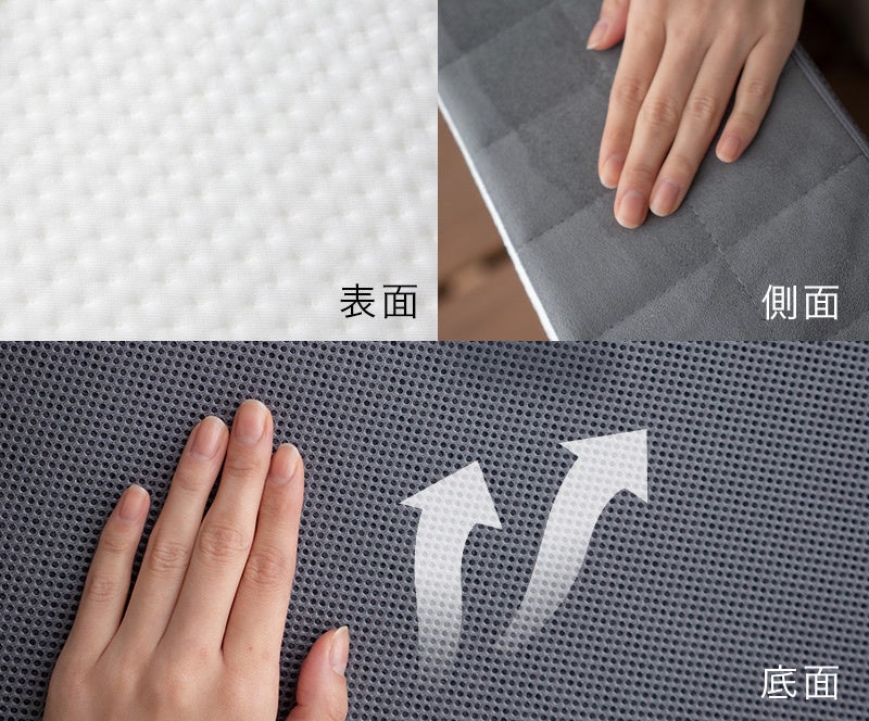 表面はふんわりとした触り心地の膨れニット生地を採用。こだわりの側面はグレーのスエード生地調の格子キルトで、まるで高級ポケットコイルマットレスを連想させる仕様に。底面は通気性の良いハニカムメッシュ生地で仕上げています。