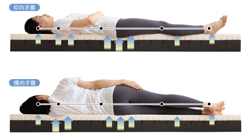 硬柔の2層構造マットレスだからできる「美しい寝姿勢キープ力」。仰向け寝・横向き寝どちらでも全身が緩んだ自然で無理のない寝姿勢を保ちます。