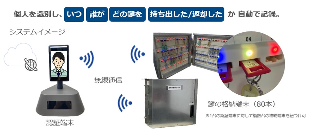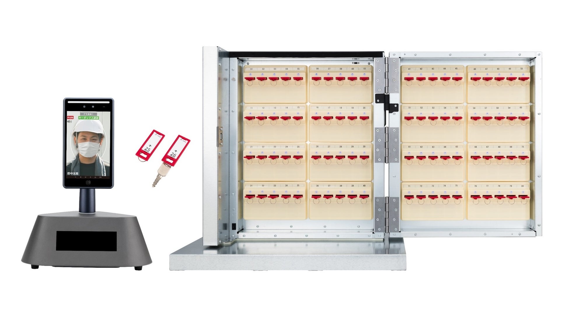 顔認証に対応した「認証端末」と数十本の鍵を管理・保管可能な「鍵の格納端末」を連携させたサービスです。予め、顔を登録したユーザー且つ、開扉権を付与された方が認証端末に顔をかざすことで、鍵の格納端末の扉が開きます。さらに、開扉したユーザーがどの鍵を持ち出したか(返却したか)を自動で記録するため、帳簿で管理していた従来の業務を自動化、ペーパーレス化します。