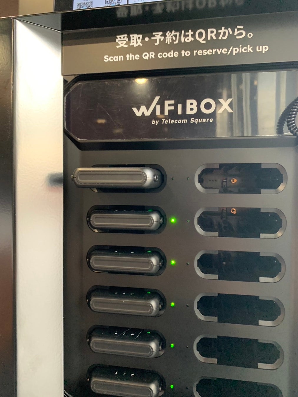 導入したレンタルWiFiサービスは株式会社テレコムスクウェアの「WiFiBOX(WiFiボックス)」。WEBからの申し込みで発行されたQRコードを受取端末機にかざすとスロットから取り出せる非接触の無人対応で、当日その場での申し込みも可能なため急にWiFi環境が必要になった場合にも便利です。また返却は借り受けた店舗でなくとも全国の主要空港で返却できることも特徴です。関西国際空港や伊丹空港、東京駅やなんばウォークなどでも返却が可能です。付属のケーブルを使えばモバイルバッテリーとしても使えます。