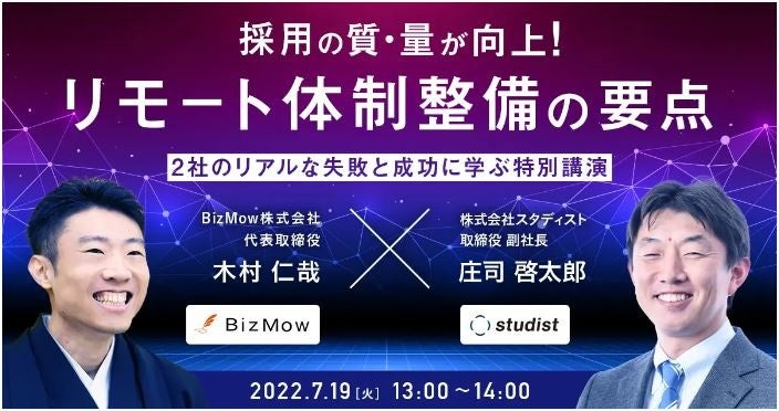 オンライン事務・経理代行サービスを提供しておりますBizMow株式会社(本社:東京都世田谷区・代表取締役:木村仁哉)は、株式会社スタディスト(本社:東京都千代田区・代表取締役:鈴木 悟史)と共催で、リモート体制整備に関するオンラインセミナーを2022年7月19日(火) 13:00より開催いたします。