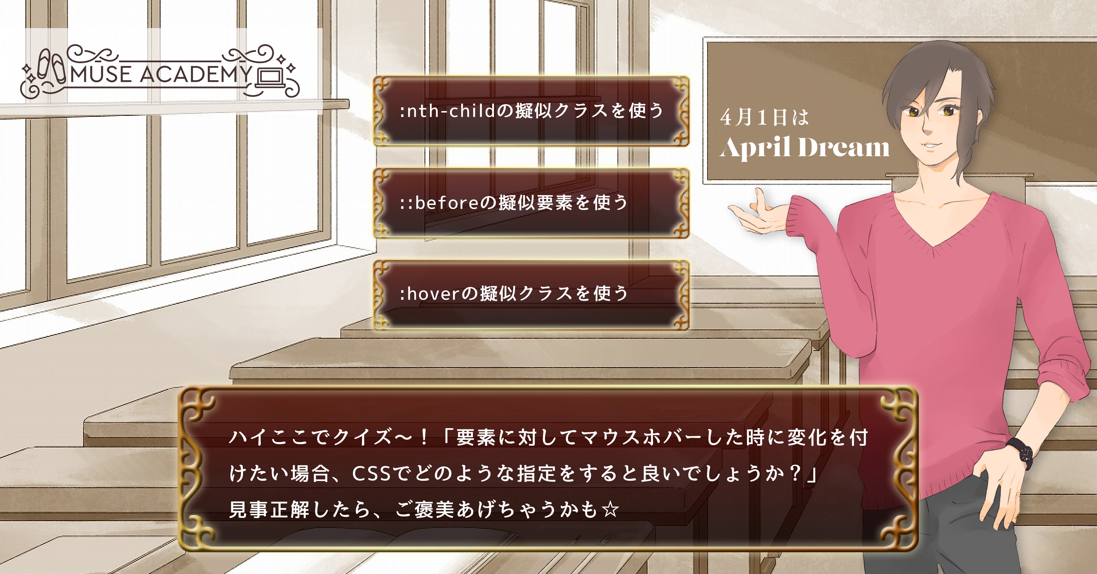 そこで、Muse Academyは学習カリキュラムを架空の学校の授業に置き換え、講師やさまざまなキャラクターと対話式のコミュニケーションを取ることで、自然とデザインやライティングのスキルが身に付き、キャラクターとの親密度が上がる「乙女ゲーム形式」の教材を開発いたしました。