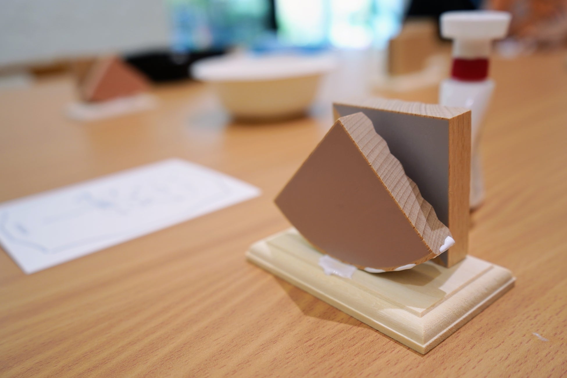 デザイナーを囲む形で今回のギフトとなるカードスタンドを制作しました。事前に寄付されていた積み木と同様のものを材料として使用したため、事前の活動からのつながりももたらすことが出来ました。大人が想定した形とは異なるデザインで制作を進める子もおり、改めて子どもたちの想像力に驚かされるシーンもありました。