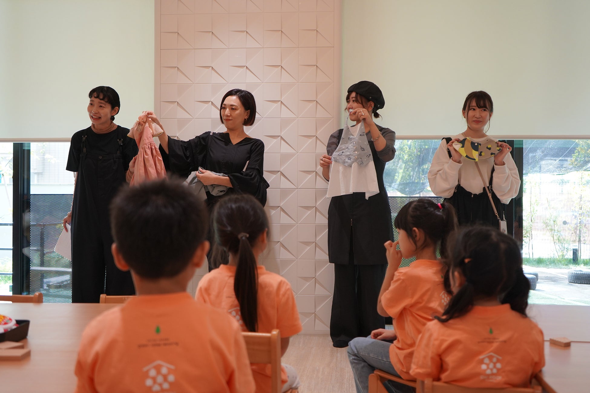 園児たちに実際に作っている洋服やグッズを見せながら「ものをデザインする」という仕事について紹介しました。またデザインするものが「ギフト」であることも紹介し「みんなは贈り物をもらうとどんな気持ち?」という問いかけを行ったところ、「うれしい!」と大きな声で答えていました。