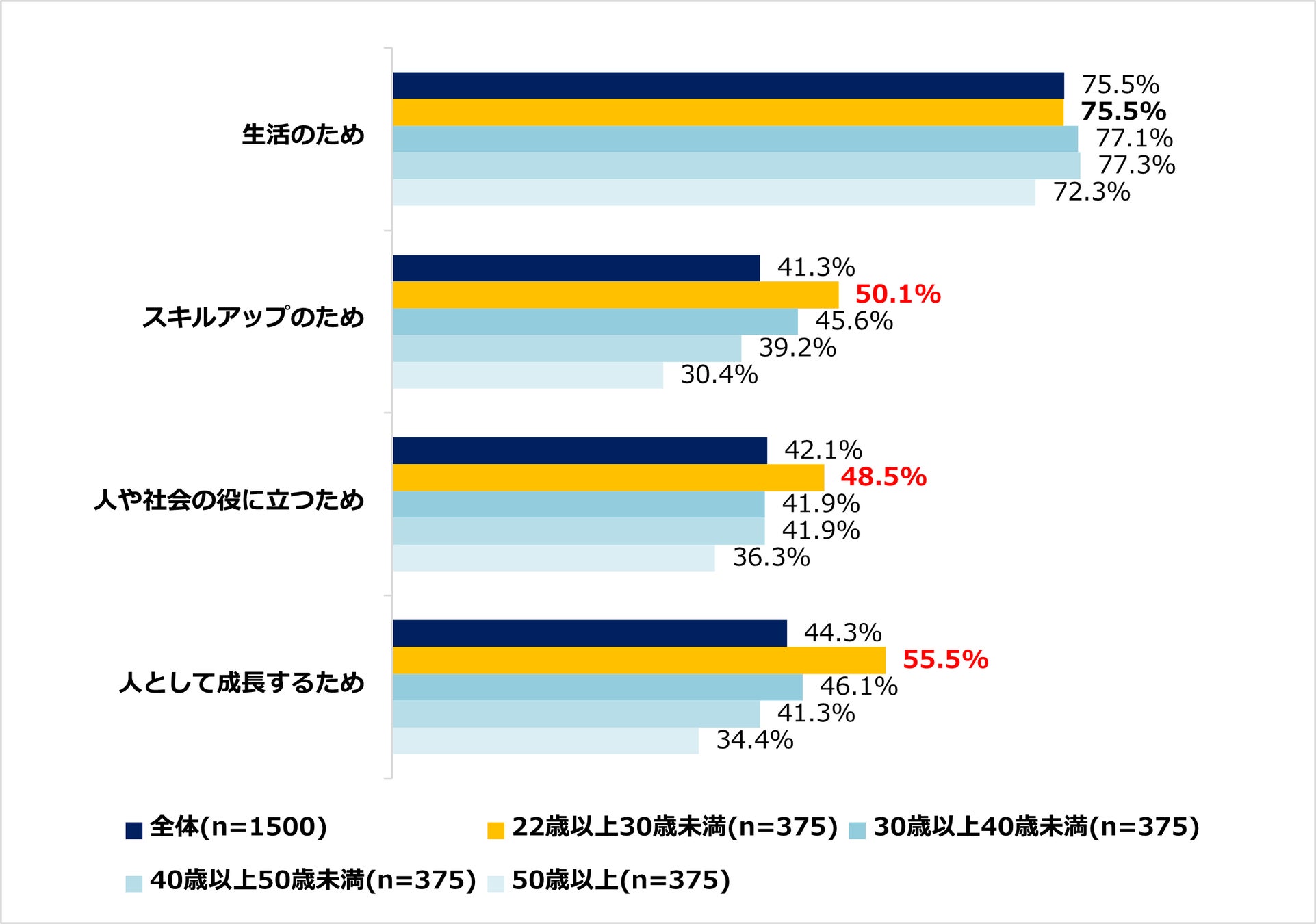 仕事の価値観を調べるため、 「生活のため」 「スキルアップのため」、「人・社会に役立つため」、「人として成長するため」 の4つの項目それぞれに対し、仕事をする上で重視するかどうかを調査しました。「生活のため」についてはどの世代も大きな差はありませんでしたが、「スキルアップのため」、「人・社会に役立つため」、「人として成長するため」については世代が若くなるほどスコアも高くなり、20代が最も高い結果となりました。特に「人・社会に役立つために働く」と考える割合は、全体と比べて20代が優位に高いことがわかりました。