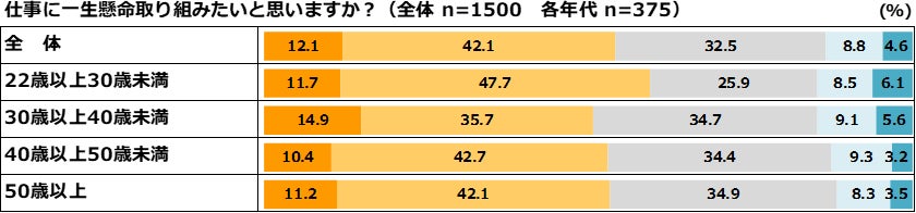 「仕事に一生懸命取り組みたいか」という質問に対し、「非常にそう思う」と回答した割合は30代が最も高く、「非常にそう思う」と「そう思う」を合わせた割合は20代が最も高い結果となりました。どの年代も半数以上は仕事に一生懸命取り組みたいと考えていることがわかりました。