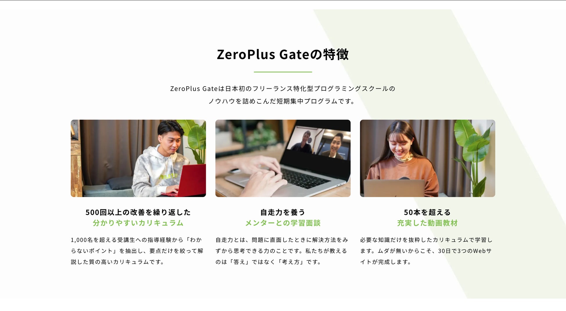 そこで、これからの未来を創る若年層が参加しやすいプログラムを実現するため、質問対応やキャリア支援などの従来のプログラミングスクールと同様のサービスを盛り込みながらも、より低単価なプログラムの提供を可能にした〝ZeroPlus Gate(ゼロプラスゲート)〟の発足に至りました。