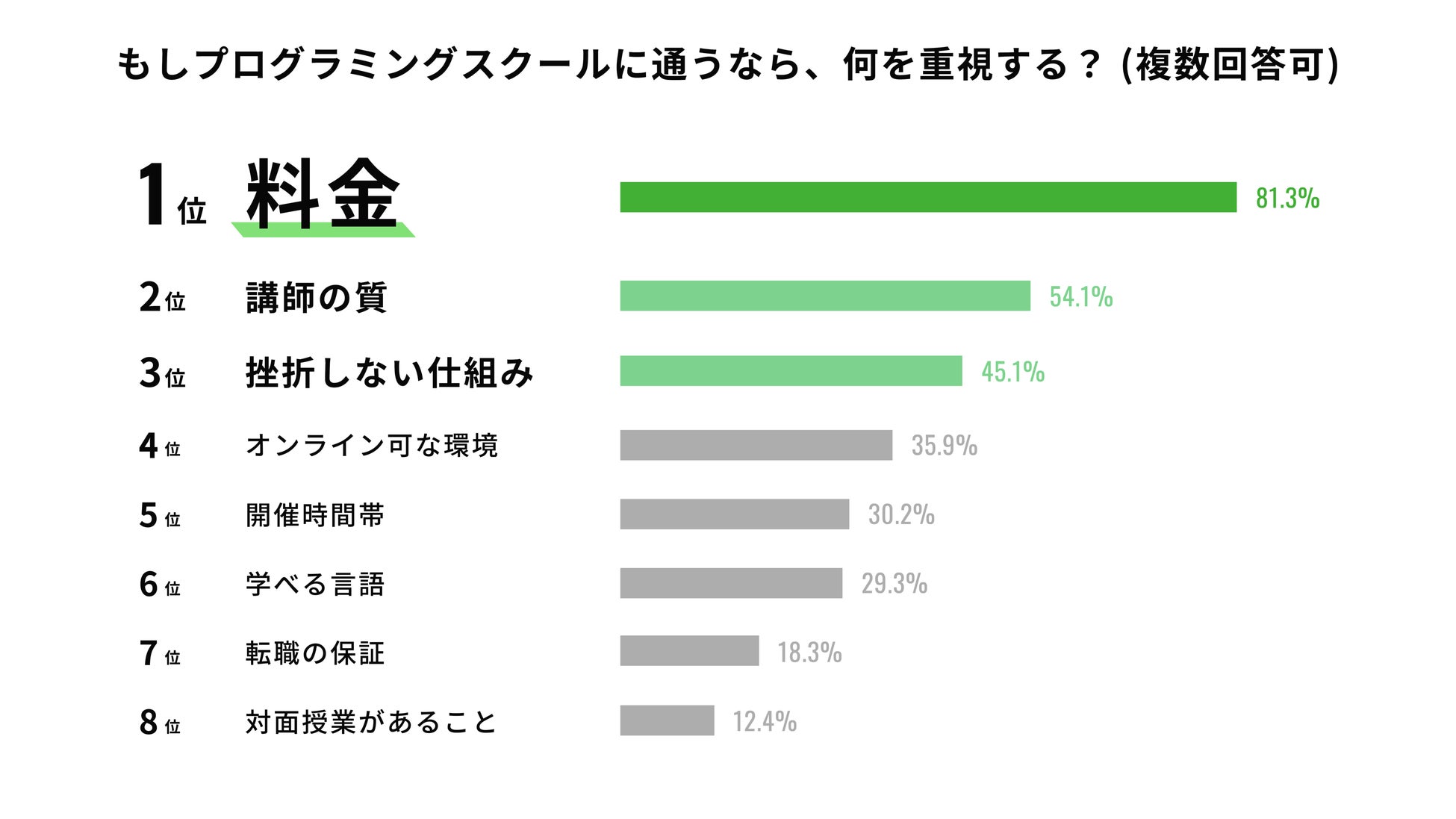 IT人材の需要とIT技術者の供給が追いついていない背景には、プログラミングスクールが高価であることが挙げられます。プログラミングスクールを選ぶ際に最も重要視されている項目が「料金」である一方で、通常のプログラミングスクールは半年間で約50万円もの費用がかかるのです。