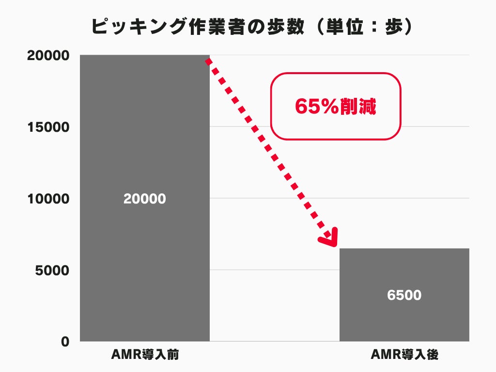 倉庫内におけるピッキング作業者の1日あたりの平均移動距離(歩数)は、AMRとゾーンピッキングを組み合わせることで、従来の約20,000歩から約6,500歩へと65%以上削減されました。これにより、作業者の身体的負担が大幅に軽減され、より働きやすい環境を実現しています。
