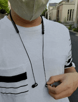 - 新素材の形状記憶合金ネックバンドが振動でお知らせ!わずか27gのイヤホンを首に掛けるだけ!