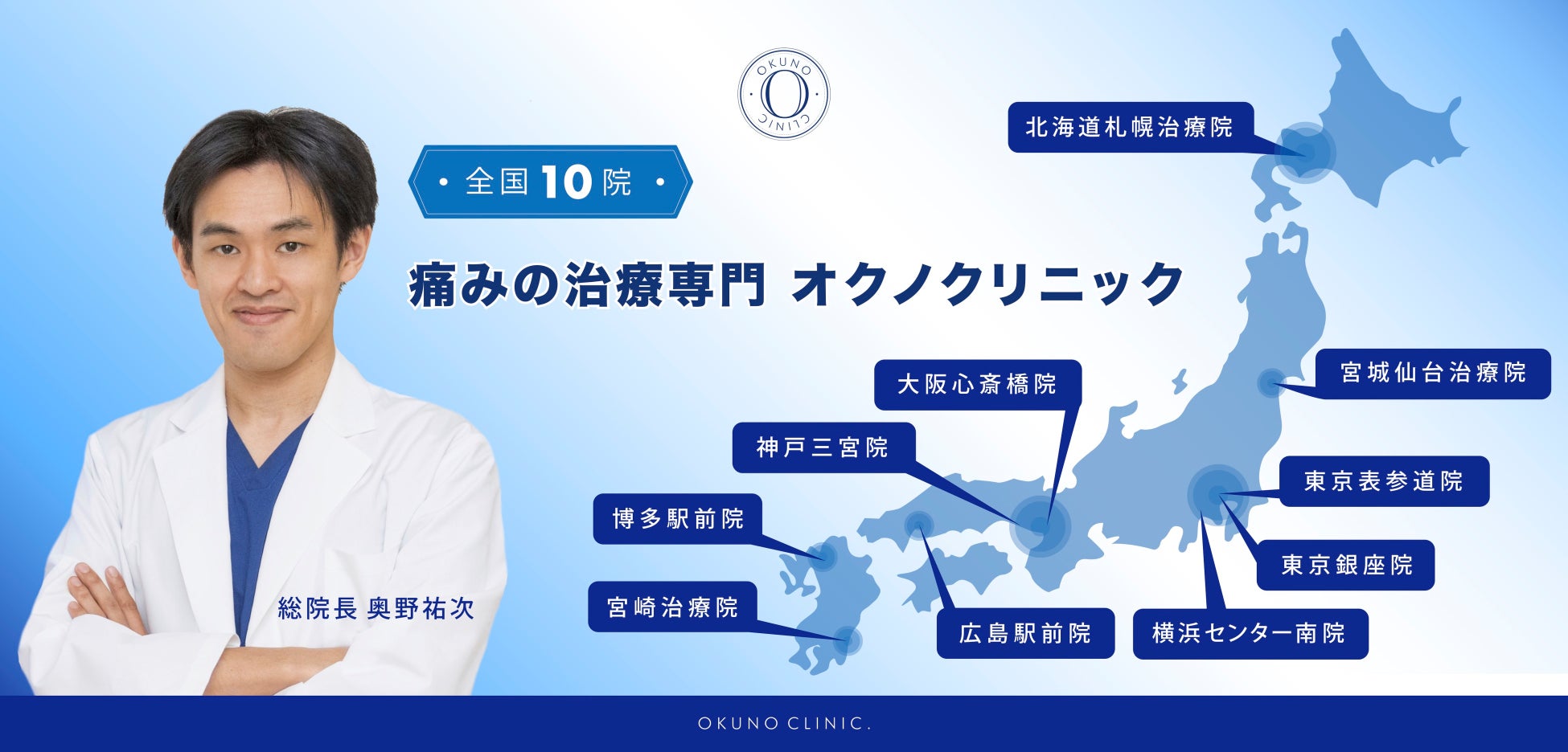 医療法人社祐優会オクノクリニックは慢性的な痛みに悩む患者さんのために効果的な治療法を提案する、痛みの専門クリニックです。東京、横浜、大阪、神戸、札幌、仙台、福岡に計11医院を展開。痛みに悩む多くの患者さんと日々向き合っています。