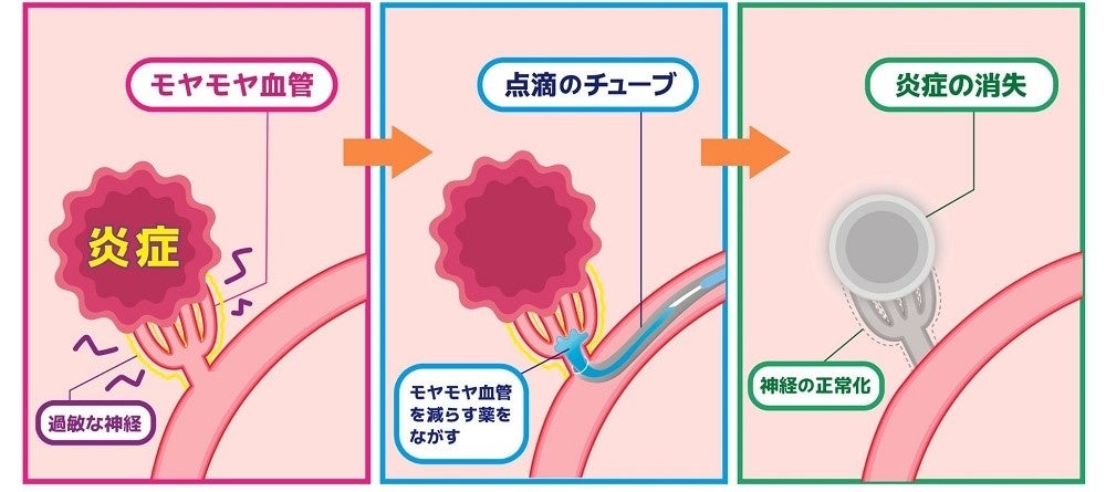この慢性的な痛みの原因となる血管と神経の増殖は、レントゲンには映りません。また湿布や塗り薬では治らないため、根本的な原因である不要にできた血管「モヤモヤ血管」を減らす治療をする必要があります。