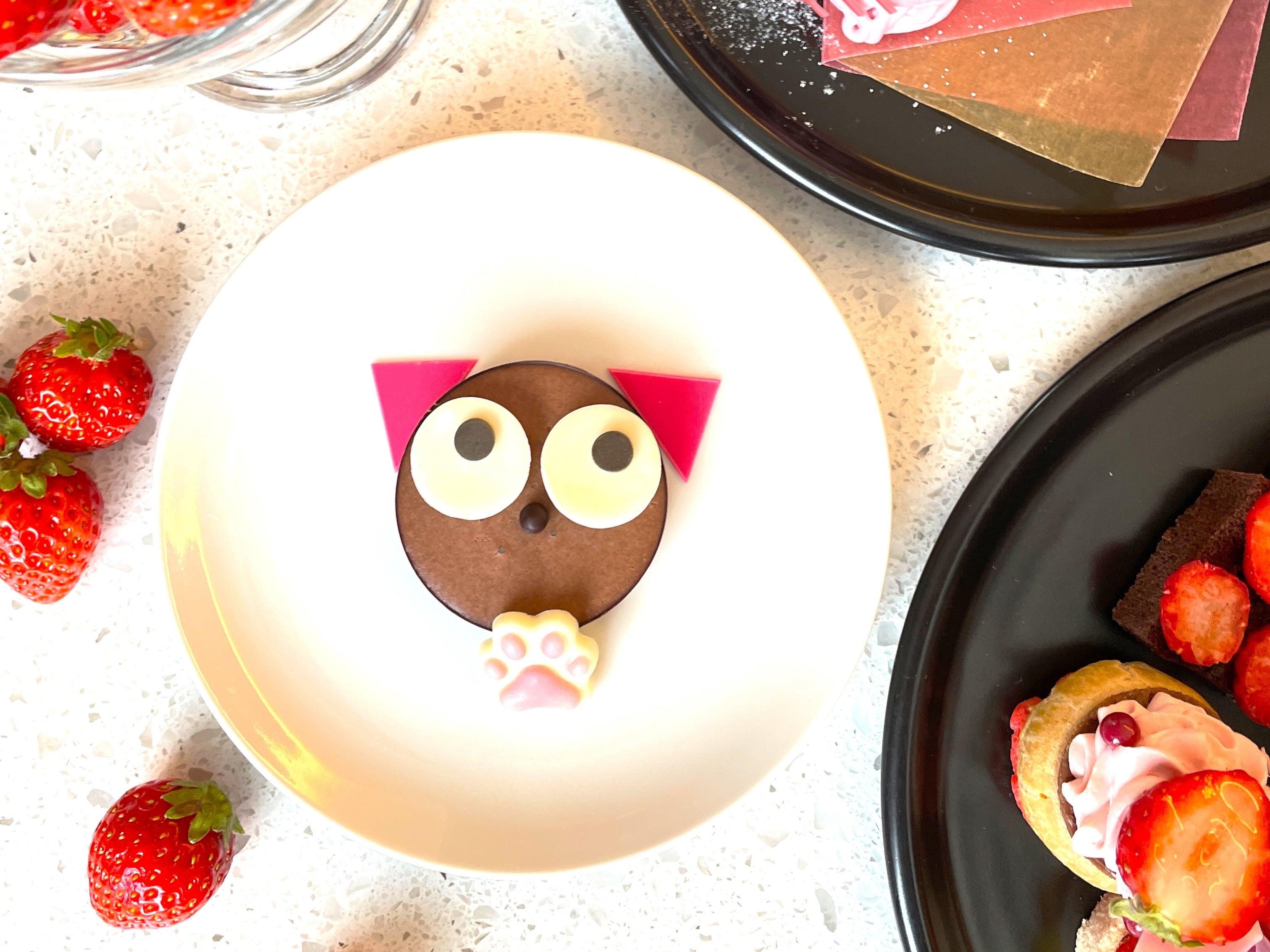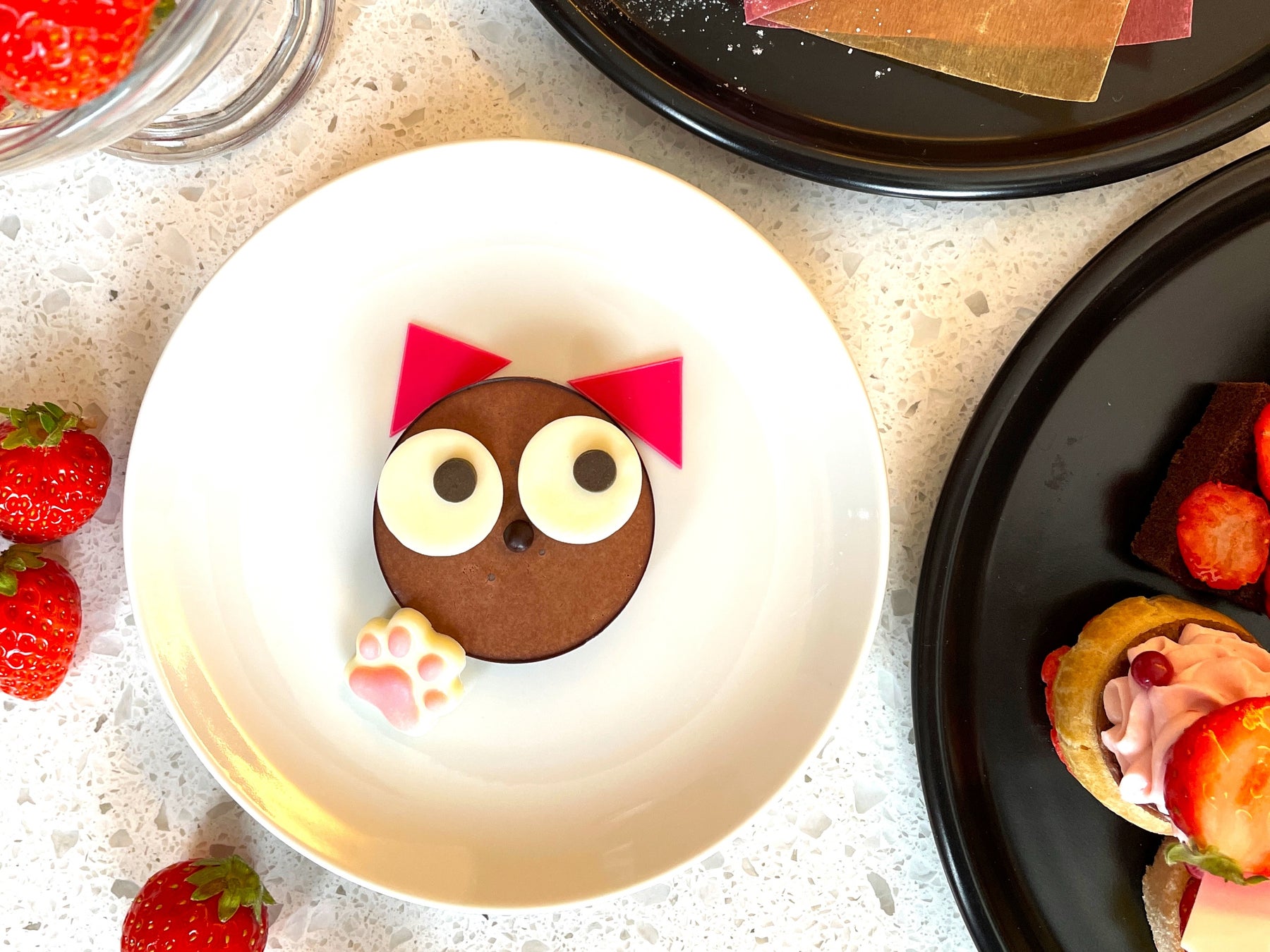 #猫は、ぜひチェレンジして欲しい創作アート。上向いたり横向いたり、正統派でもシュール派(?)でも。インルームアフタヌーンティーだからこそのお楽しみです。