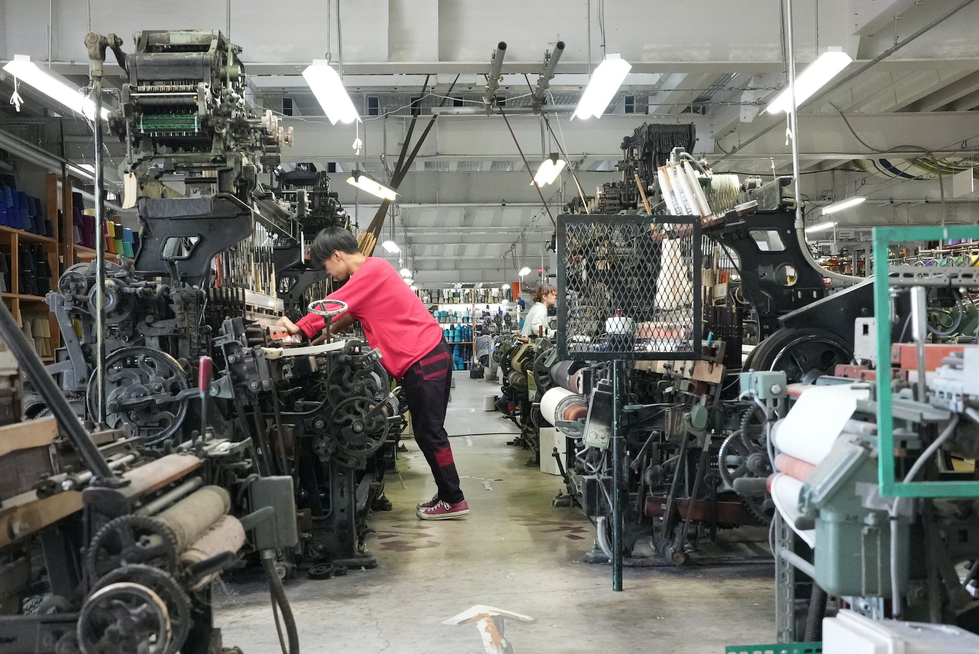 また、古い染色工場をリノベーションし本社兼店舗・工房として活用したり、若手の職人やデザイナーたちが、1960年代の力織機をはじめとする機械を修理しながら作品を生産するといった、この土地の技術を次の世代へ繋いでいく、循環型の経営体制も構築しています。