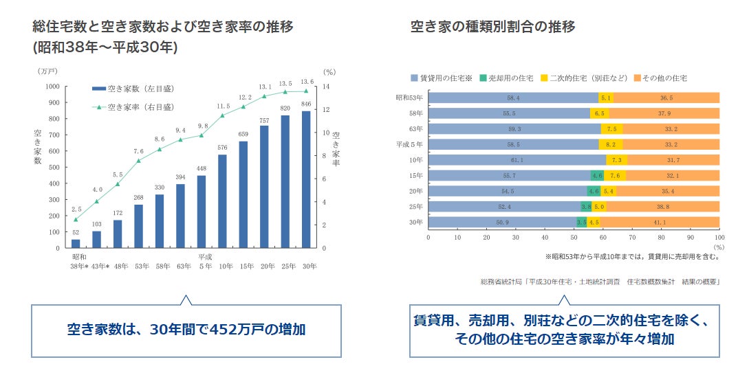近年、国内の空き家問題はさらに深刻化しており、20年で空き家総数が1.5倍に増加し、空き家率が過去最高に達し、今後も上昇が続く見通しです。空き家を放置すると資産価値の下落や維持費支払いなどオーナー自身の負担だけでなく、倒壊や放火の恐れ、雑草や害虫などによる近隣住居とのトラブルも予想されます。