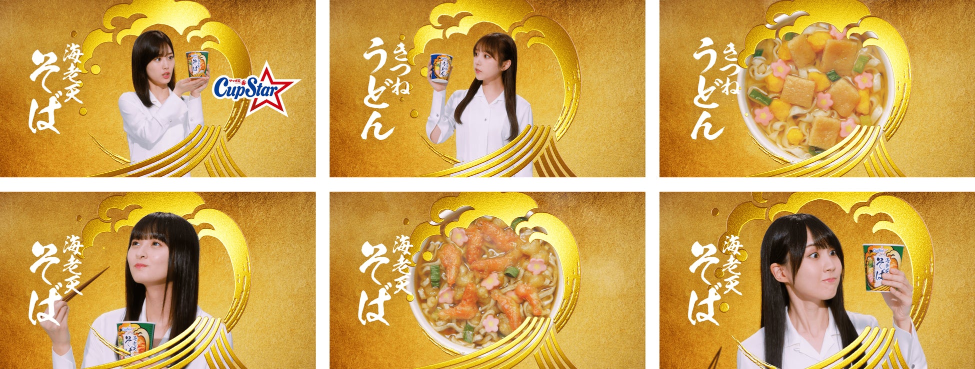 新TVCMでは、乃木坂46の山下美月さん、与田祐希さん、遠藤さくらさん、賀喜遥香さん、井上和さんが出演し、お揃いの衣装を身にまとい、リニューアルしたパッケージの富士山と波のモチーフの中から、カップスター「和風シリーズ」を味わい尽くす模様が描かれています。出演されているメンバーがカップスター「和風シリーズ」を美味しそうに食べる表情にご注目ください。
