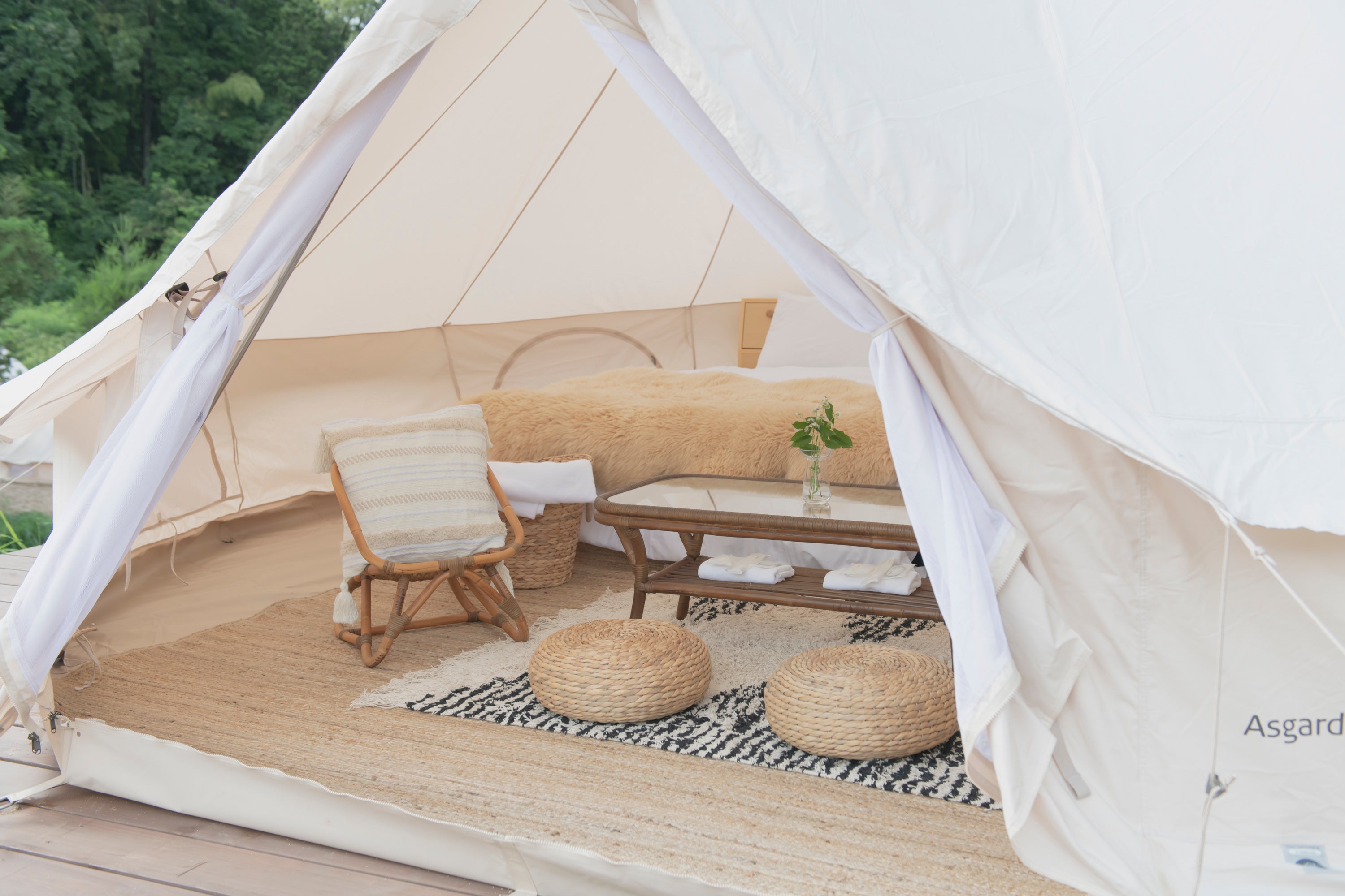 テント内にはベッドやエアコンをはじめ、ホテル並みの設備。アメニティも用意しているため、手ぶらで楽しめる。