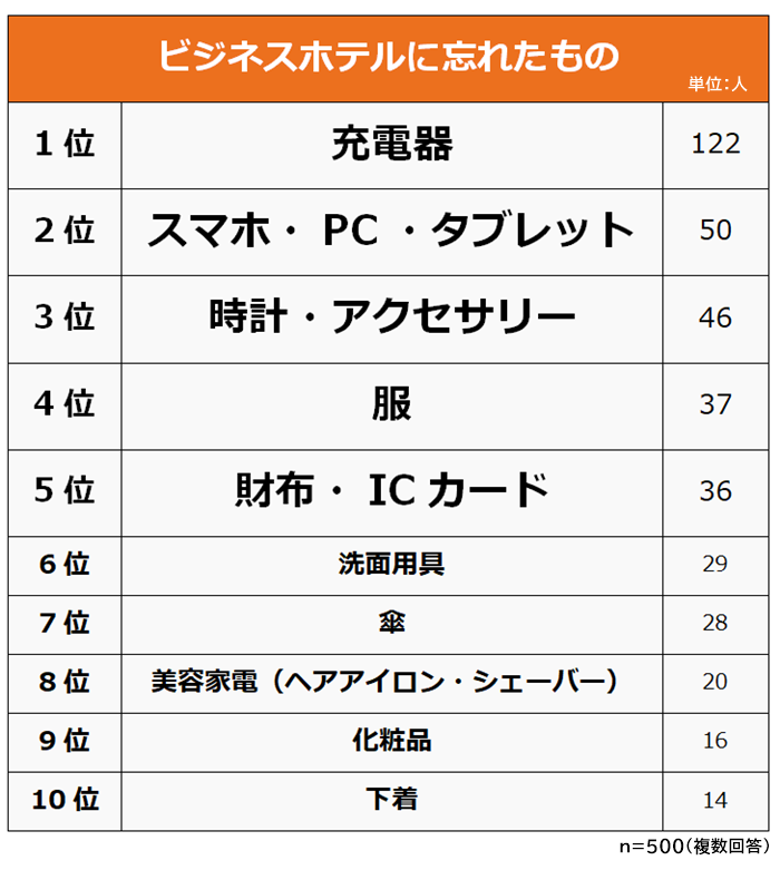 【ビジネスホテルの忘れ物ランキング】男女500人アンケート調査