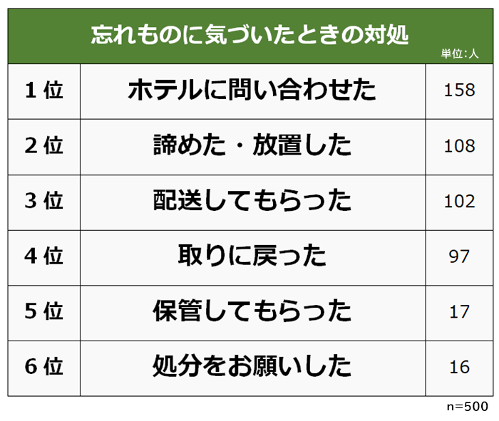 - 忘れ物に気づいたときの対処は「ホテルに問い合わせた」が1位